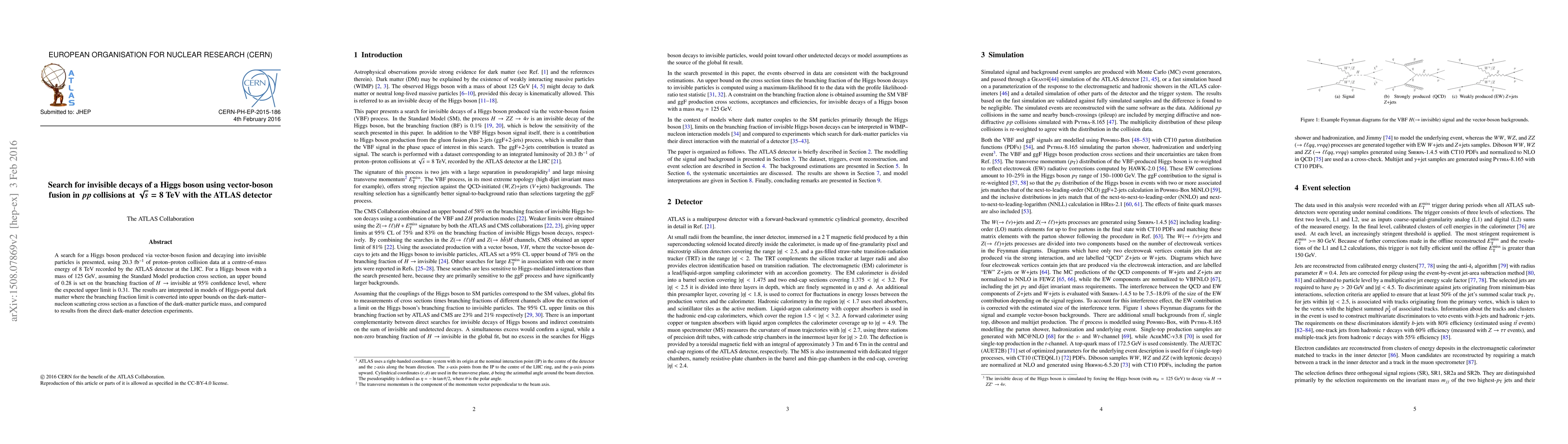 This paper reports a search for a Higgs boson decaying into invisible particles via vector-boson fusion using 20.3 fb$^{-1}$ of LHC data at 8 TeV. An upper limit of 0.28 on the branching fraction for $H\to$ invisible is set at 95% confidence level.