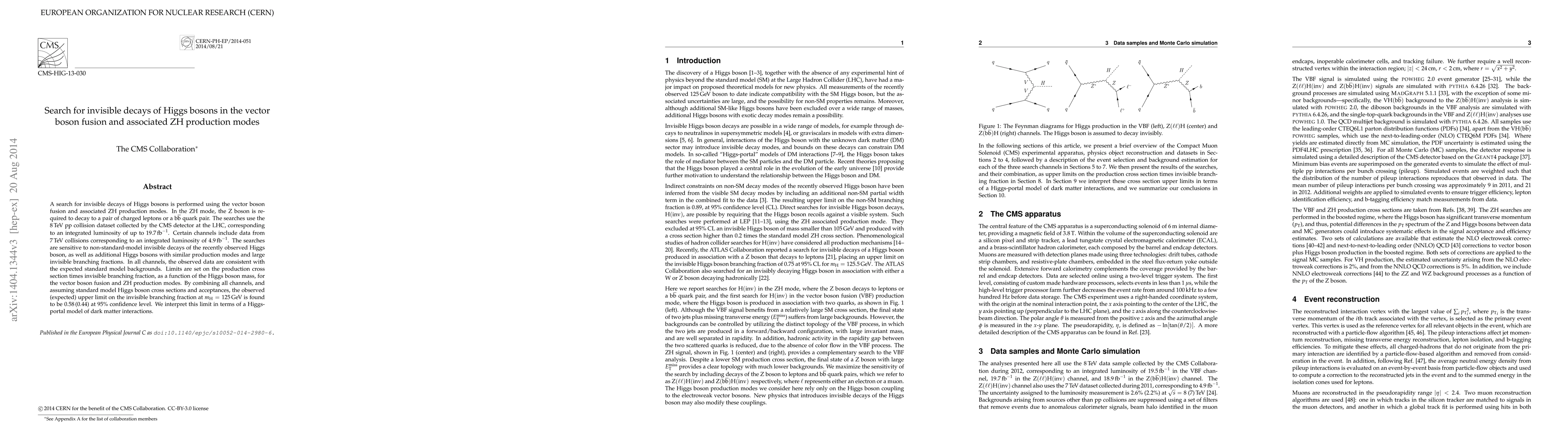 This paper investigates invisible decays of Higgs bosons via vector boson fusion and associated ZH production modes, using data from the CMS detector at the LHC. The observed data align with standard model predictions, setting limits on the invisible branching fraction of Higgs bosons, with an upper limit of 0.58 (expected 0.44) at 95% confidence level for a Higgs mass of 125 GeV.