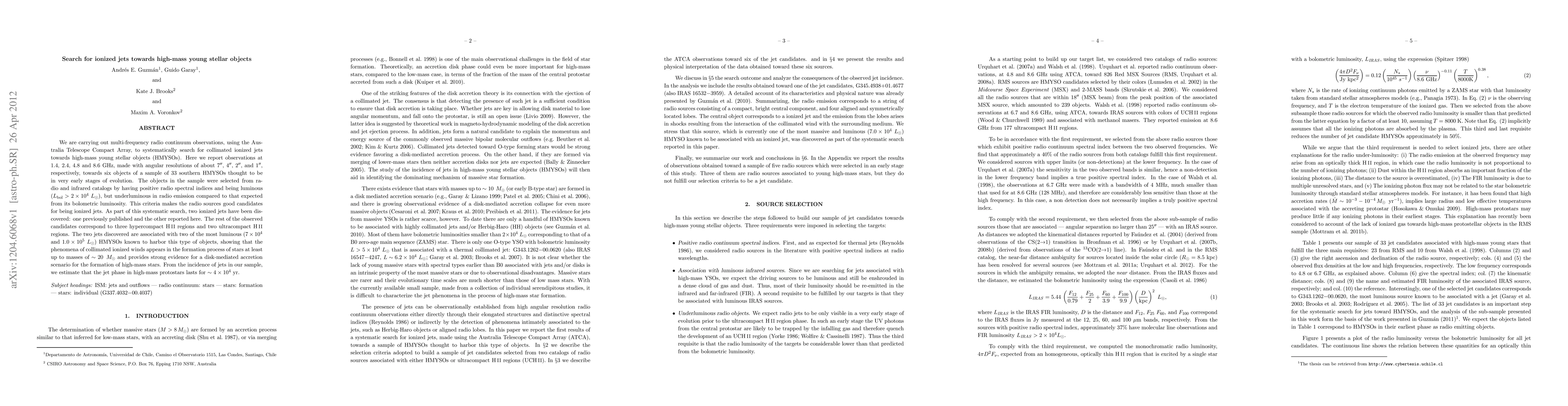 We are carrying out multi-frequency radio continuum observations, using the Australia Telescope Compact Array, to systematically search for collimated ionized jets towards high-mass young stellar objects (HMYSOs). Here we report observations at 1.4, 2.4, 4.8 and 8.6 GHz, made with angular resolutions of about 7, 4, 2, and 1 arcsec, respectively, towards six objects of a sample of 33 southern HMYSOs thought to be in very early stages of evolution. The objects in the sample were selected from radio and infrared catalogs by having positive radio spectral indices and being luminous (L_bol > 20,000 L_sun), but underluminous in radio emission compared to that expected from its bolometric luminosity. This criteria makes the radio sources good candidates for being ionized jets. As part of this systematic search, two ionized jets have been discovered: one previously published and the other reported here. The rest of the observed candidates correspond to three hypercompact hii regions and two ultracompact hii regions. The two jets discovered are associated with two of the most luminous (70,000 and 100,000 Lsun) HMYSOs known to harbor this type of objects, showing that the phenomena of collimated ionized winds appears in the formation process of stars at least up to masses of ~ 20 M_sun and provides strong evidence for a disk-mediated accretion scenario for the formation of high-mass stars. From the incidence of jets in our sample, we estimate that the jet phase in high-mass protostars lasts for 40,000 yr.