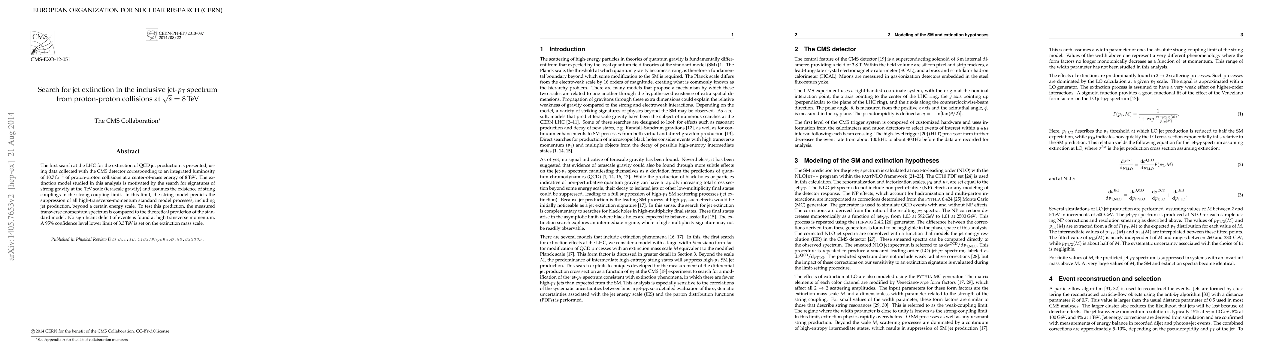 The first search at the LHC for the extinction of QCD jet production is presented, using data collected with the CMS detector corresponding to an integrated luminosity of 10.7 inverse femtobarns of proton-proton collisions at a center-of-mass energy of 8 TeV. The extinction model studied in this analysis is motivated by the search for signatures of strong gravity at the TeV scale (terascale gravity) and assumes the existence of string couplings in the strong-coupling limit. In this limit, the string model predicts the suppression of all high-transverse-momentum standard model processes, including jet production, beyond a certain energy scale. To test this prediction, the measured transverse-momentum spectrum is compared to the theoretical prediction of the standard model. No significant deficit of events is found at high transverse momentum. A 95% confidence level lower limit of 3.3 TeV is set on the extinction mass scale.