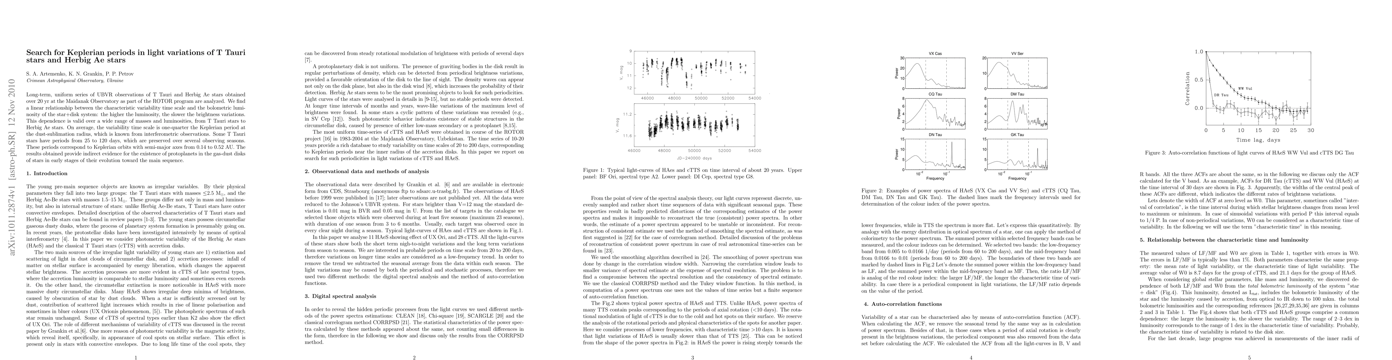 This study analyzes long-term UBVR observations of T Tauri and Herbig Ae stars, revealing a correlation between variability time scale and bolometric luminosity. It suggests the presence of protoplanets in the gas-dust disks of these stars based on detected Keplerian periods.