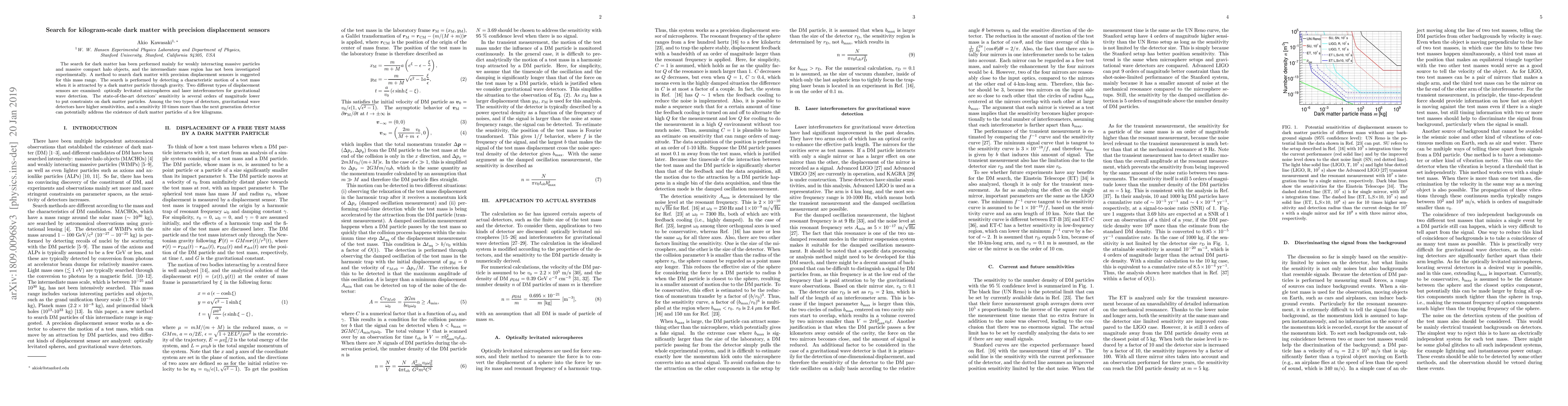 This paper proposes a novel method to search for kilogram-scale dark matter using precision displacement sensors, specifically optically levitated microspheres and laser interferometers. Gravitational wave detectors show the highest sensitivity, potentially constraining the existence of dark matter particles weighing several kilograms.