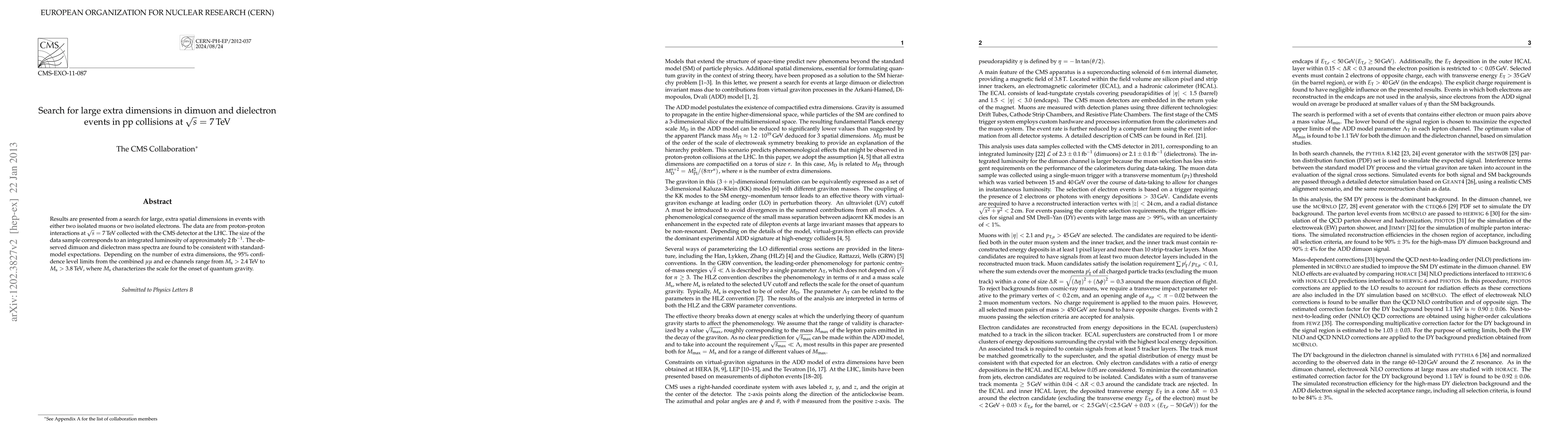 This paper reports on a search for large extra dimensions using dimuon and dielectron events from proton-proton collisions at 7 TeV in the CMS detector at the LHC. No deviations from standard-model predictions were observed, setting limits on the size of extra dimensions at 95% confidence level ranging from 2.4 TeV to 3.8 TeV.