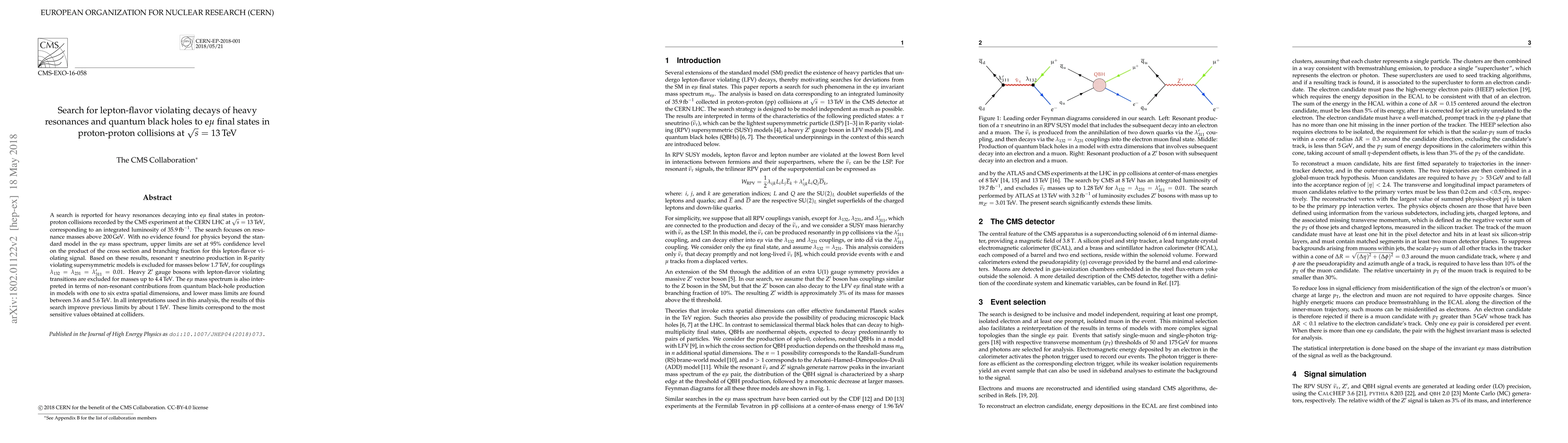 This paper reports a search for heavy resonances and quantum black holes decaying into e$\mu$ final states in proton-proton collisions at 13 TeV, with no evidence found for lepton-flavor violation. It sets new upper limits on the production of such particles, improving previous limits by about 1 TeV.