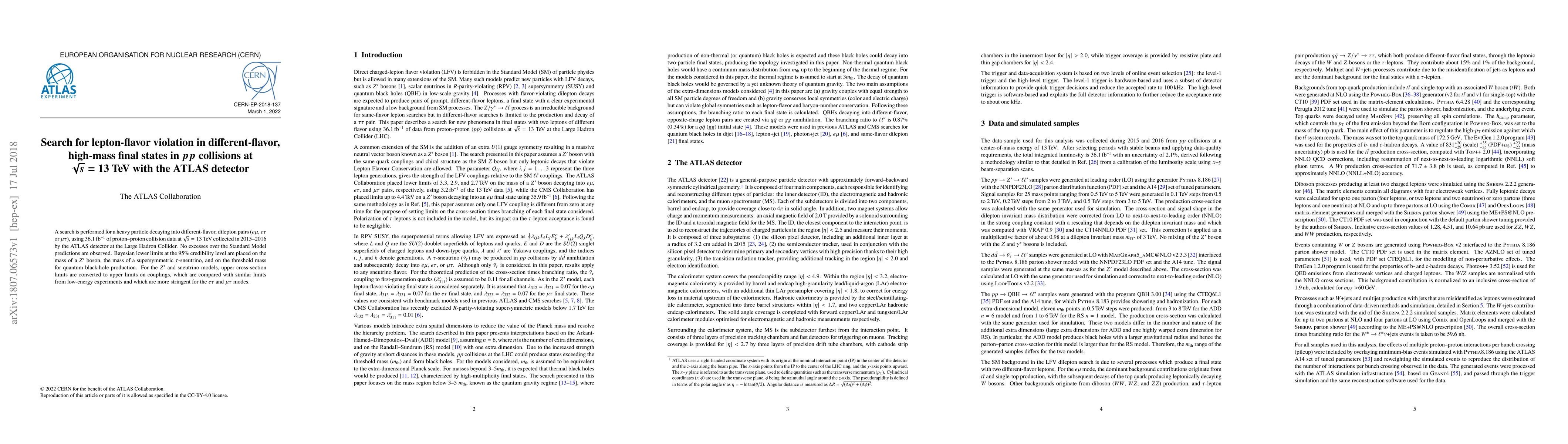 A search is performed for a heavy particle decaying into different-flavor, dilepton pairs ($e\mu$, $e\tau$ or $\mu\tau$), using 36.1 fb$^{-1}$ of proton-proton collision data at $\sqrt{s}=13$ TeV collected in 2015-2016 by the ATLAS detector at the Large Hadron Collider. No excesses over the Standard Model predictions are observed. Bayesian lower limits at the 95% credibility level are placed on the mass of a $Z^{\prime}$ boson, the mass of a supersymmetric $\tau$-sneutrino, and on the threshold mass for quantum black-hole production. For the $Z^{\prime}$ and sneutrino models, upper cross-section limits are converted to upper limits on couplings, which are compared with similar limits from low-energy experiments and which are more stringent for the $e\tau$ and $\mu\tau$ modes