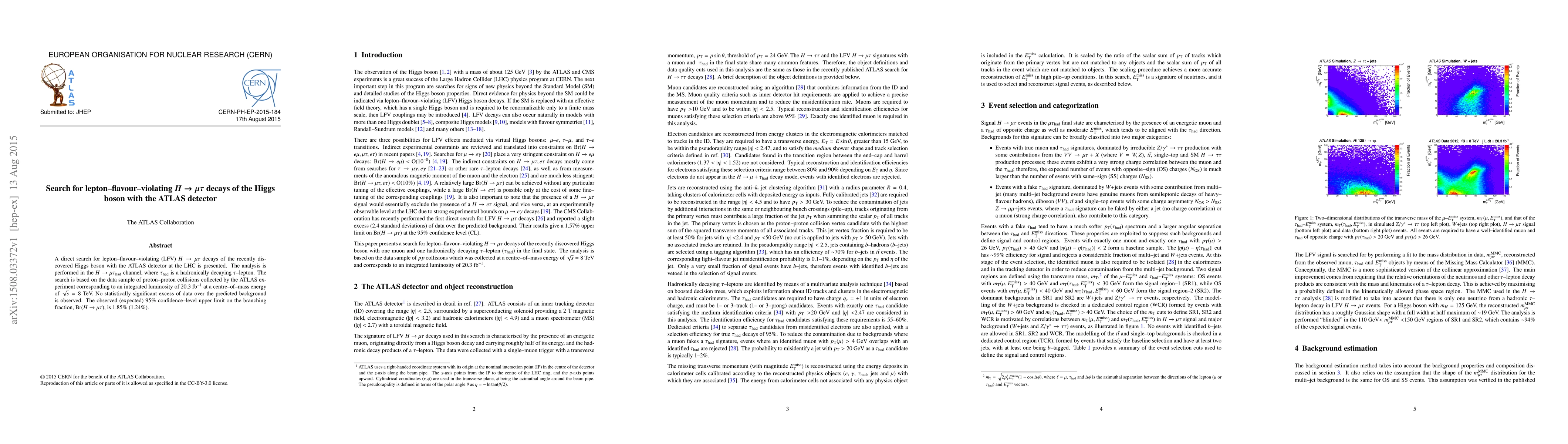 This paper reports a search for lepton-flavour-violating decays of the Higgs boson ($H\to\mu\tau$) using the ATLAS detector at the LHC, finding no significant excess over background. The observed upper limit on the branching fraction for this decay is set at 1.85% at 95% confidence level.