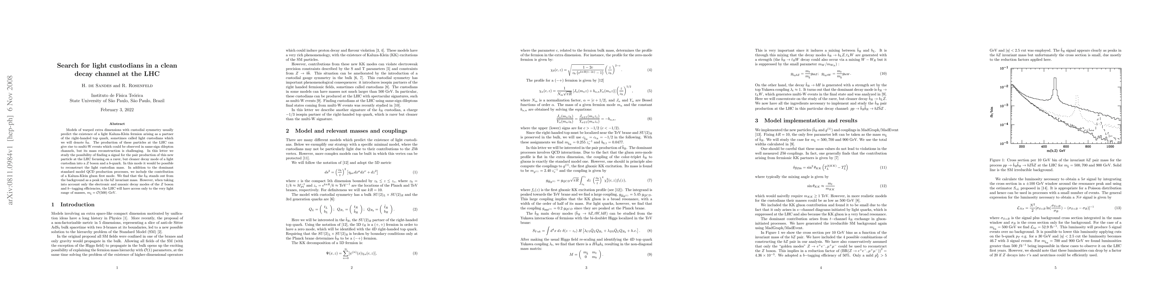 Models of warped extra dimensions with custodial symmetry usually predict the existence of a light Kaluza-Klein fermion arising as a partner of the right-handed top quark, sometimes called light custodians which we will denote $\tilde{b}_R$. The production of these particles at the LHC can give rise to multi-W events which could be observed in same-sign dilepton channels, but its mass reconstruction is challenging. In this letter we study the possibility of finding a signal for the pair production of this new particle at the LHC focusing on a rarer, but cleaner decay mode of a light custodian into a $Z$ boson and a $b$-quark. In this mode it would be possible to reconstruct the light custodian mass. In addition to the dominant standard model QCD production processes, we include the contribution of a Kaluza-Klein gluon first mode. We find that the $\tilde{b}_R$ stands out from the background as a peak in the $b Z$ invariant mass. However, when taking into account only the electronic and muonic decay modes of the $Z$ boson and $b-$tagging efficiencies, the LHC will have access only to the very light range of masses, $m_{\tilde{b}} = {\cal O} (500)$ GeV.