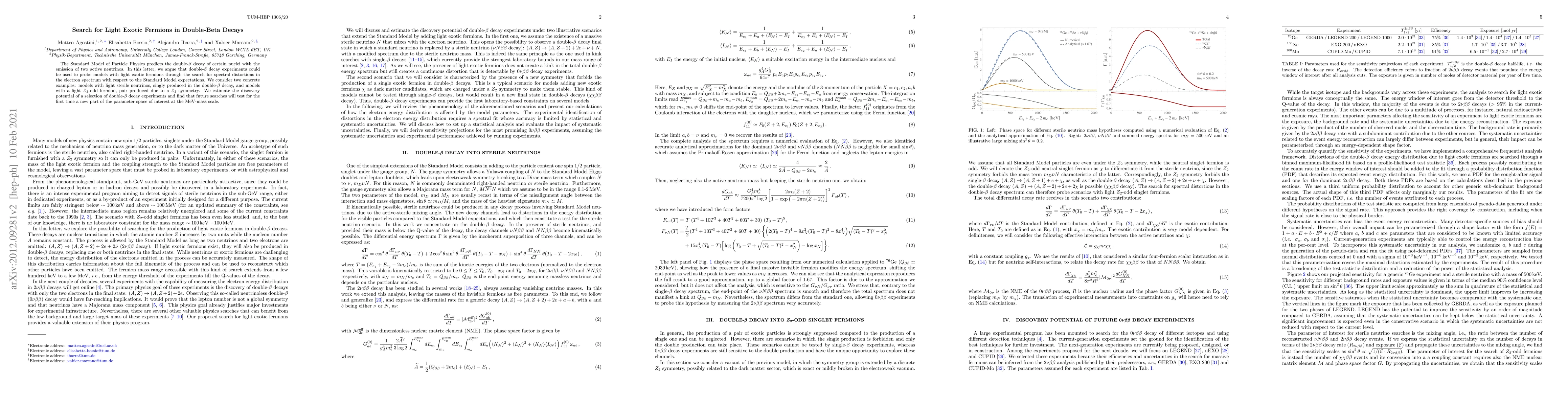 This paper explores the potential of double-$\beta$ decay experiments to detect light exotic fermions, such as sterile neutrinos or $Z_2$-odd fermions, by searching for spectral distortions in the electron spectrum. The study estimates the future discovery potential of these experiments, indicating they will probe new parameter spaces at the MeV-mass scale.
