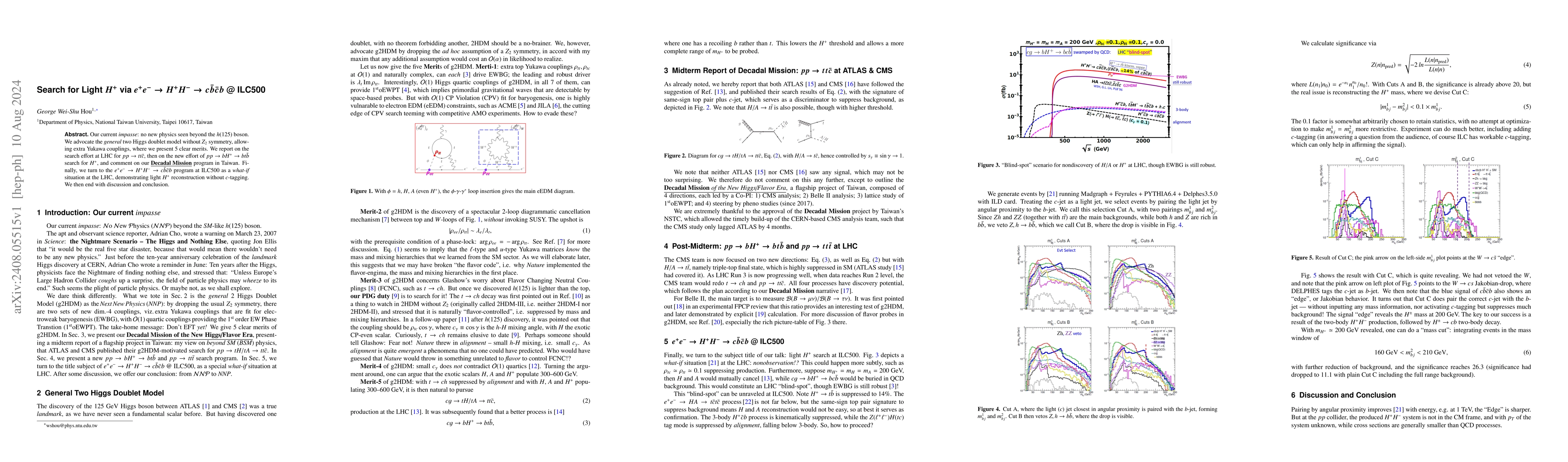 Our current {\it impasse}: no new physics seen beyond the $h(125)$ boson. We advocate the {\it general} two Higgs doublet model without $Z_2$ symmetry, allowing extra Yukawa couplings, where we present 5 clear merits. We report on the search effort at LHC for $pp \to tt\bar c$, then on the new effort of $pp \to bH^+ \to bt\bar b$ search for $H^+$, and comment on our \underline{\bf Decadal Mission} program in Taiwan. Finally, we turn to the $e^+e^- \to H^+H^- \to c\bar b\bar cb$ program at ILC500 as a {\it what-if} situation at the LHC, demonstrating light $H^+$ reconstruction without $c$-tagging. We then end with discussion and conclusion.