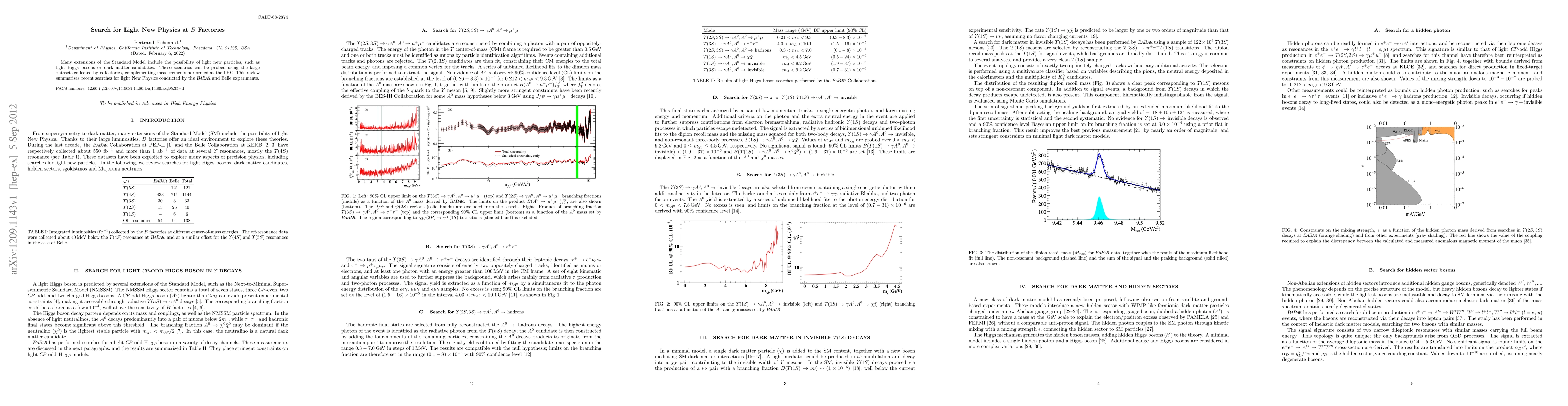 Summary: This paper reviews recent investigations by the BABAR and Belle experiments into potential light new particles beyond the Standard Model, utilizing extensive B-factory data to complement LHC findings. The focus is on probing scenarios involving light Higgs bosons or dark matter candidates.