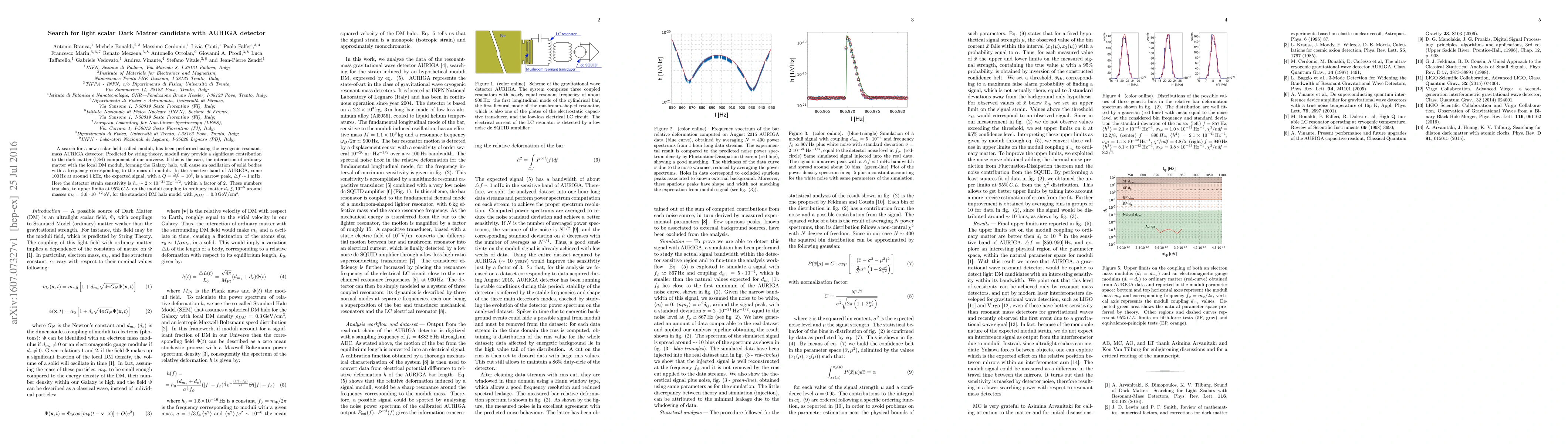 A search for a new scalar field, called moduli, has been performed using the cryogenic resonant-mass AURIGA detector. Predicted by string theory, moduli may provide a significant contribution to the dark matter (DM) component of our universe. If this is the case, the interaction of ordinary matter with the local DM moduli, forming the Galaxy halo, will cause an oscillation of solid bodies with a frequency corresponding to the mass of moduli. In the sensitive band of AURIGA, some $100\,\mathrm{Hz}$ at around $1\,\mathrm{kHz}$, the expected signal, with a $Q=\tfrac{\triangle f}{f}\sim10^{6}$, is a narrow peak, $\triangle f\sim1\,\mathrm{mHz}$. Here the detector strain sensitivity is $h_{s}\sim2\times10^{-21}\,\mathrm{Hz^{-1/2}}$, within a factor of $2$. These numbers translate to upper limits at $95\%\,C.L.$ on the moduli coupling to ordinary matter $d_{e}\lesssim10^{-5}$ around masses $m_{\phi}=3.6\cdot10^{-12}\,\mathrm{eV}$, for the standard DM halo model with $\rho_{DM}=0.3\,\mathrm{GeV/cm^{3}}$.