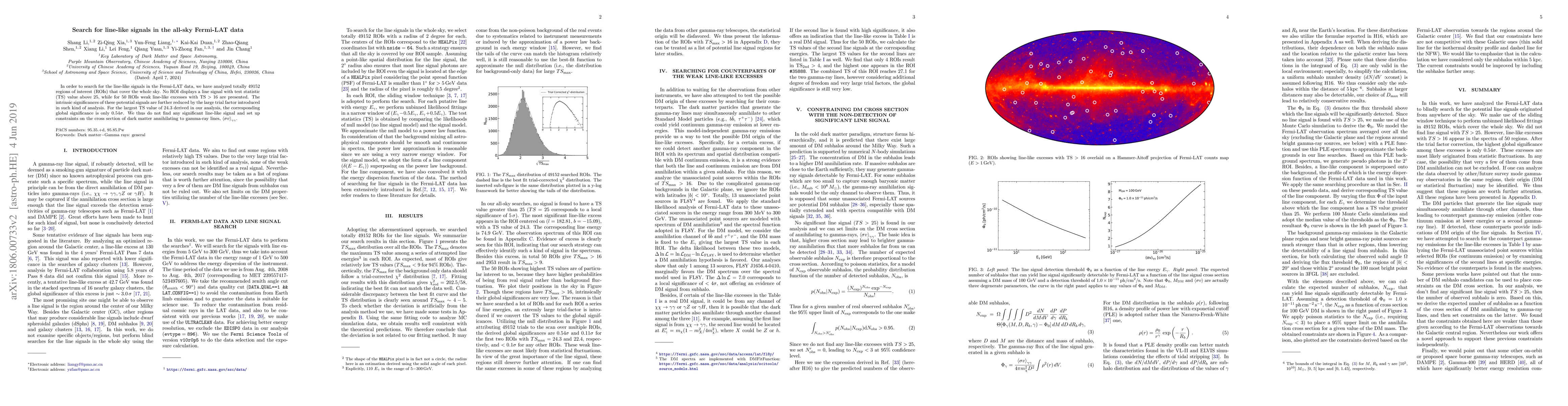 In order to search for the line-like signals in the Fermi-LAT data, we have analyzed totally 49152 regions of interest (ROIs) that cover the whole sky. No ROI displays a line signal with test statistic (TS) value above 25, while for 50 ROIs weak line-like excesses with ${\rm TS}>16$ are presented. The intrinsic significances of these potential signals are further reduced by the large trial factor introduced in such kind of analysis. For the largest TS value of 24.3 derived in our analysis, the corresponding global significance is only $0.54\sigma$. We thus do not find any significant line-like signal and set up constraints on the cross section of dark matter annihilating to gamma-ray lines, $\left<\sigma{v}\right>_{\gamma\gamma}$.