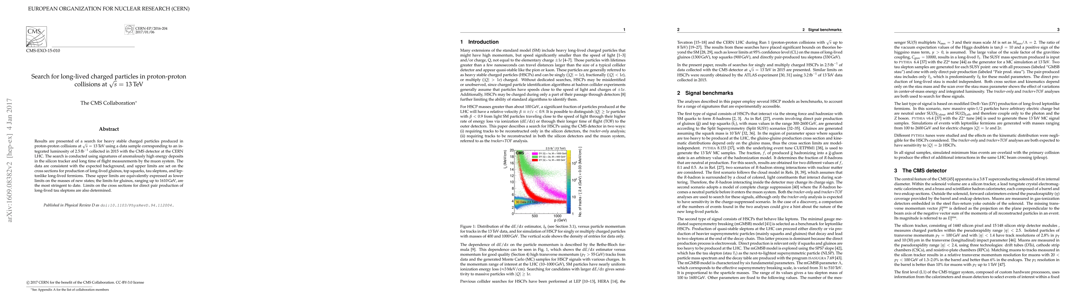 This paper reports a search for long-lived charged particles in proton-proton collisions at 13 TeV using the CMS detector at the LHC, finding no evidence for their existence and setting stringent upper limits on the production cross sections of various new particles, including gluinos up to 1610 GeV.