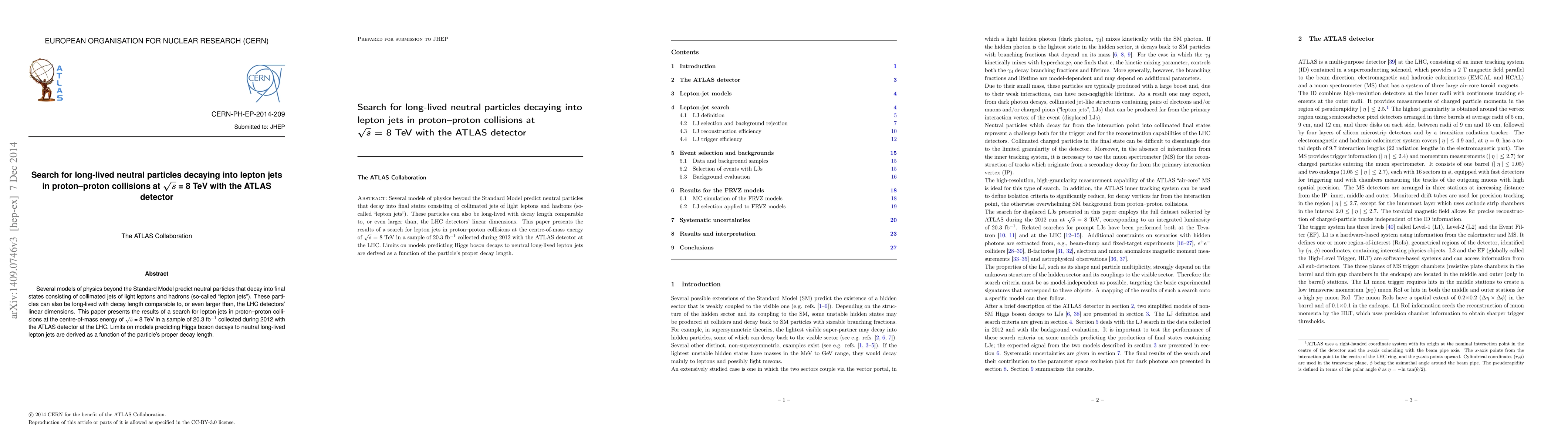 This paper reports a search for long-lived neutral particles decaying into lepton jets in proton-proton collisions at $\sqrt{s}$ = 8 TeV using the ATLAS detector, analyzing 20.3 fb$^{-1}$ of data from 2012. It derives limits on models predicting Higgs boson decays to such particles as a function of their decay length.