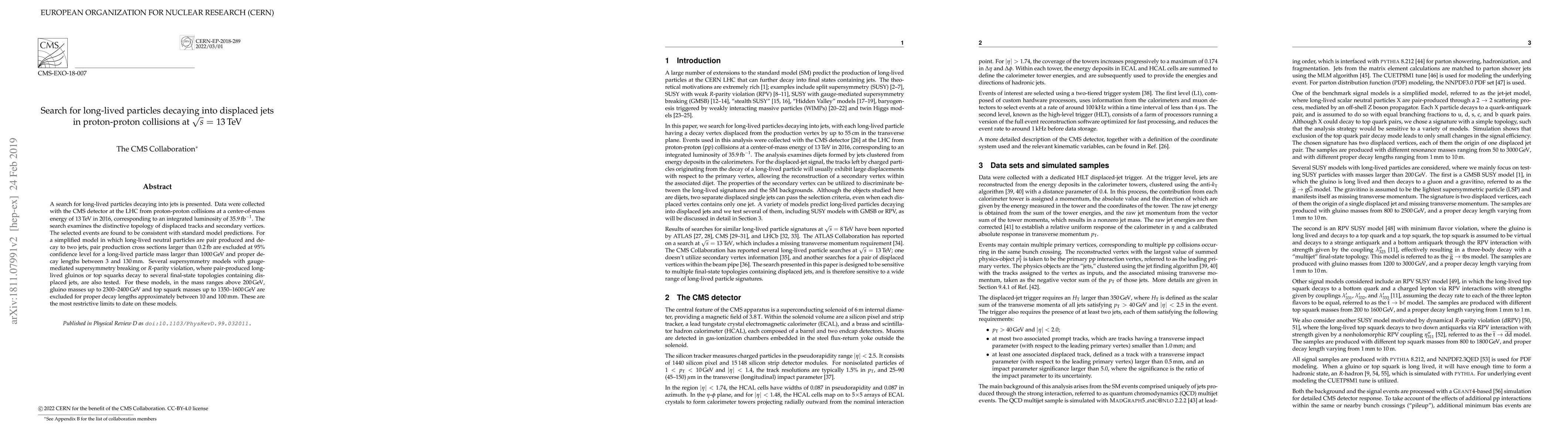This paper reports a search for long-lived particles decaying into displaced jets in proton-proton collisions at 13 TeV using the CMS detector at the LHC. No significant deviations from standard model predictions were found, leading to exclusions of certain supersymmetric models and long-lived particle masses and decay lengths.