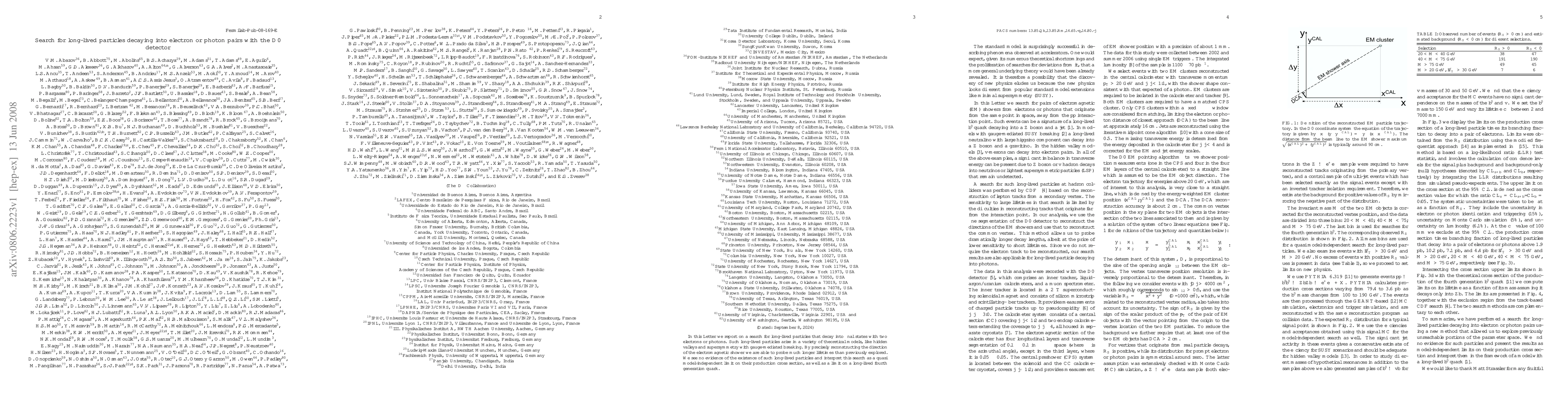 Researchers searched for long-lived particles that decay into electron or photon pairs using the D0 detector, finding no evidence of their existence and setting a limit on production cross-sections and long-lived fourth generation quark lifetimes.