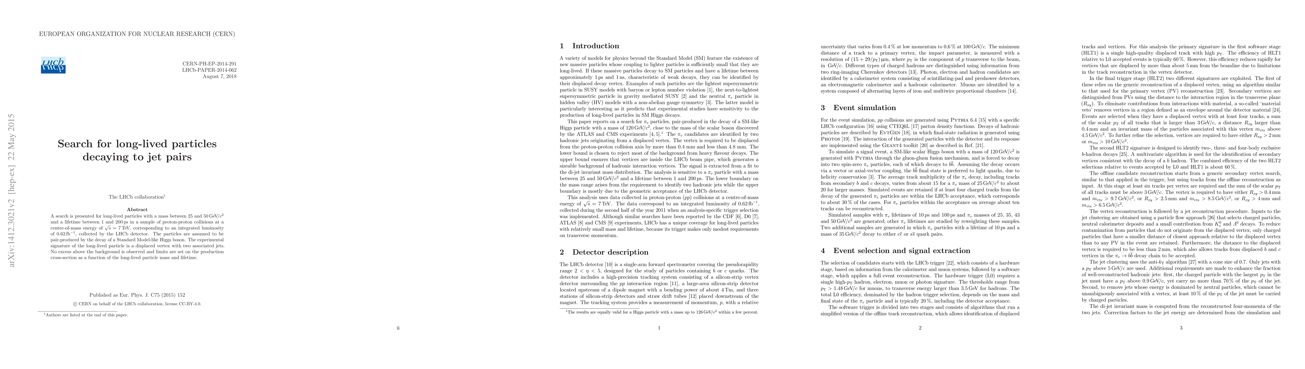 This paper reports a search for long-lived particles in proton-proton collisions at 7 TeV with the LHCb detector, finding no evidence of such particles in the mass range 25-50 GeV$/c^2$ and lifetime range 1-200 ps. Limits on the production cross-section are established based on the absence of observed excesses.
