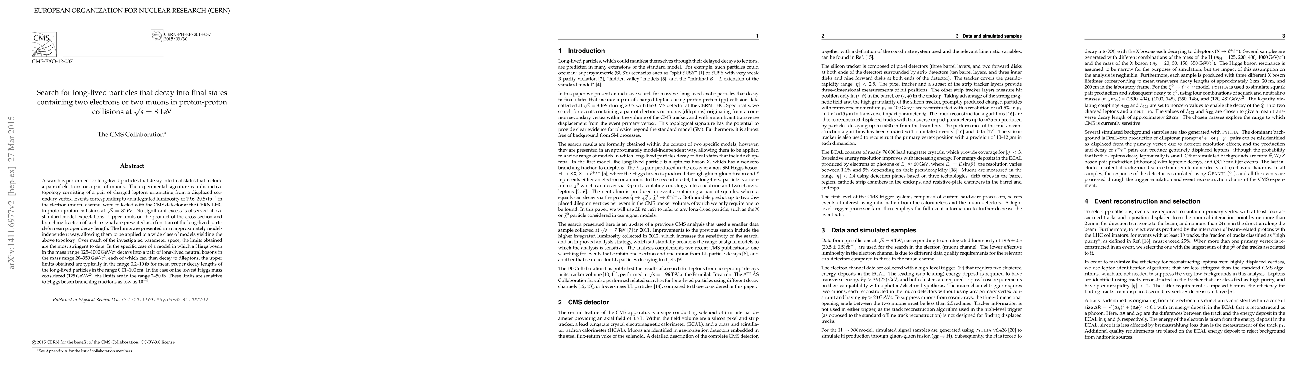 A search is performed for long-lived particles that decay into final states that include a pair of electrons or a pair of muons. The experimental signature is a distinctive topology consisting of a pair of charged leptons originating from a displaced secondary vertex. Events corresponding to an integrated luminosity of 19.6 (20.5) inverse femtobarns in the electron (muon) channel were collected with the CMS detector at the CERN LHC in proton-proton collisions at sqrt(s) = 8 TeV. No significant excess is observed above standard model expectations. Upper limits on the product of the cross section and branching fraction of such a signal are presented as a function of the long-lived particle's mean proper decay length. The limits are presented in an approximately model-independent way, allowing them to be applied to a wide class of models yielding the above topology. Over much of the investigated parameter space, the limits obtained are the most stringent to date. In the specific case of a model in which a Higgs boson in the mass range 125-1000 GeV decays into a pair of long-lived neutral bosons in the mass range 20-350 GeV, each of which can then decay to dileptons, the upper limits obtained are typically in the range 0.2-10 fb for mean proper decay lengths of the long-lived particles in the range 0.01-100 cm. In the case of the lowest Higgs mass considered (125 GeV), the limits are in the range 2-50 fb. These limits are sensitive to Higgs boson branching fractions as low as 1E-4.