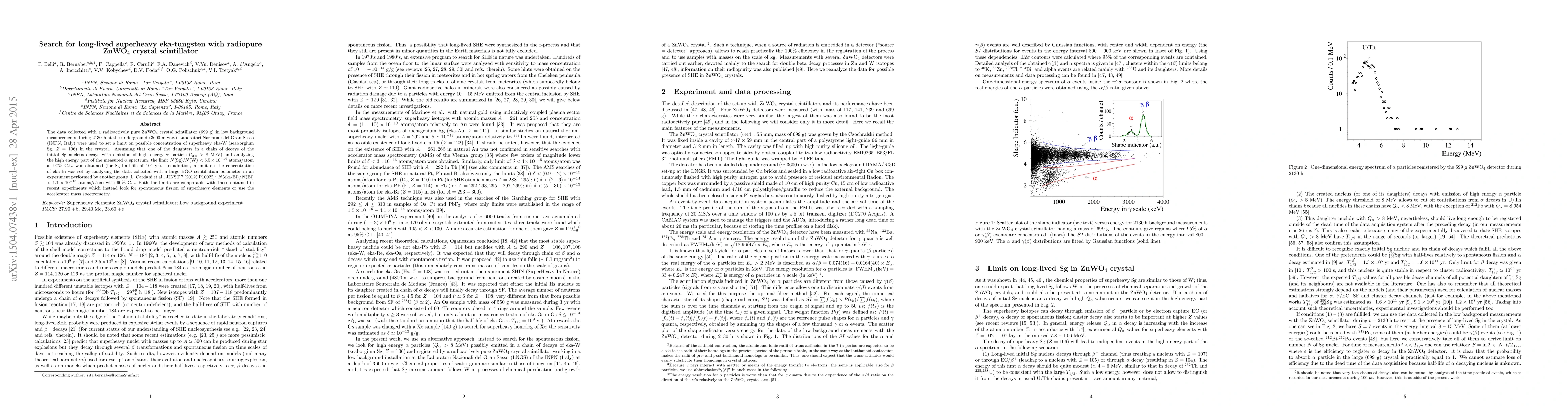 The data collected with a radioactively pure ZnWO$_4$ crystal scintillator (699 g) in low background measurements during 2130 h at the underground (3600 m w.e.) Laboratori Nazionali del Gran Sasso (INFN, Italy) were used to set a limit on possible concentration of superheavy eka-W (seaborgium Sg, Z = 106) in the crystal. Assuming that one of the daughters in a chain of decays of the initial Sg nucleus decays with emission of high energy $\alpha$ particle ($Q_\alpha > 8$ MeV) and analyzing the high energy part of the measured $\alpha$ spectrum, the limit N(Sg)/N(W) < 5.5 $\times$ 10$^{-14}$ atoms/atom at 90% C.L. was obtained (for Sg half-life of 10$^9$ yr). In addition, a limit on the concentration of eka-Bi was set by analysing the data collected with a large BGO scintillation bolometer in an experiment performed by another group [L. Cardani et al., JINST 7 (2012) P10022]: N(eka-Bi)/N(Bi) < 1.1 $\times$ 10$^{-13}$ atoms/atom with 90% C.L. Both the limits are comparable with those obtained in recent experiments which instead look for spontaneous fission of superheavy elements or use the accelerator mass spectrometry.
