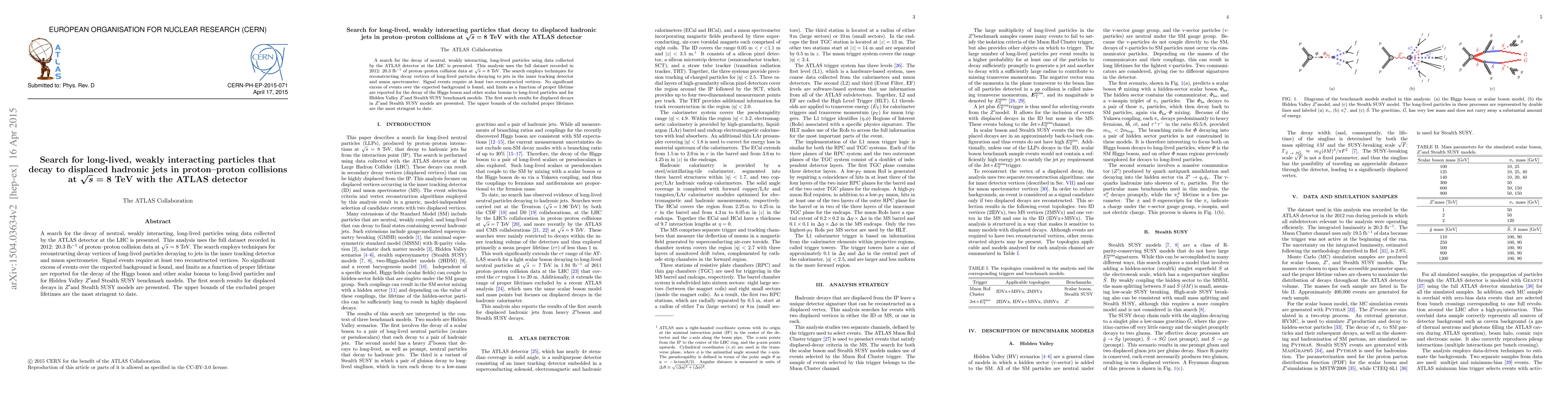 ATLAS detector searched for long-lived particles decaying to displaced jets in proton-proton collisions at 8 TeV, setting upper bounds on their lifetimes and finding no significant excess.