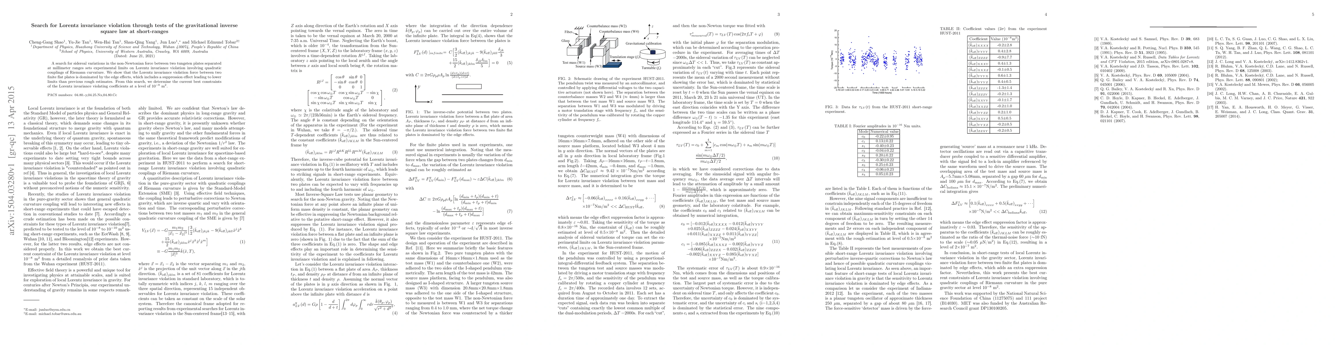 A search for sidereal variations in the non-Newtonian force between two tungsten plates separated at millimeter ranges sets experimental limits on Lorentz invariance violation involving quadratic couplings of Riemann curvature. We show that the Lorentz invariance violation force between two finite flat plates is dominated by the edge effects, which includes a suppression effect leading to lower limits than previous rough estimates. From this search, we determine the current best constraints of the Lorentz invariance violating coefficients at a level of $10^{-8}$ m$^{2}$.