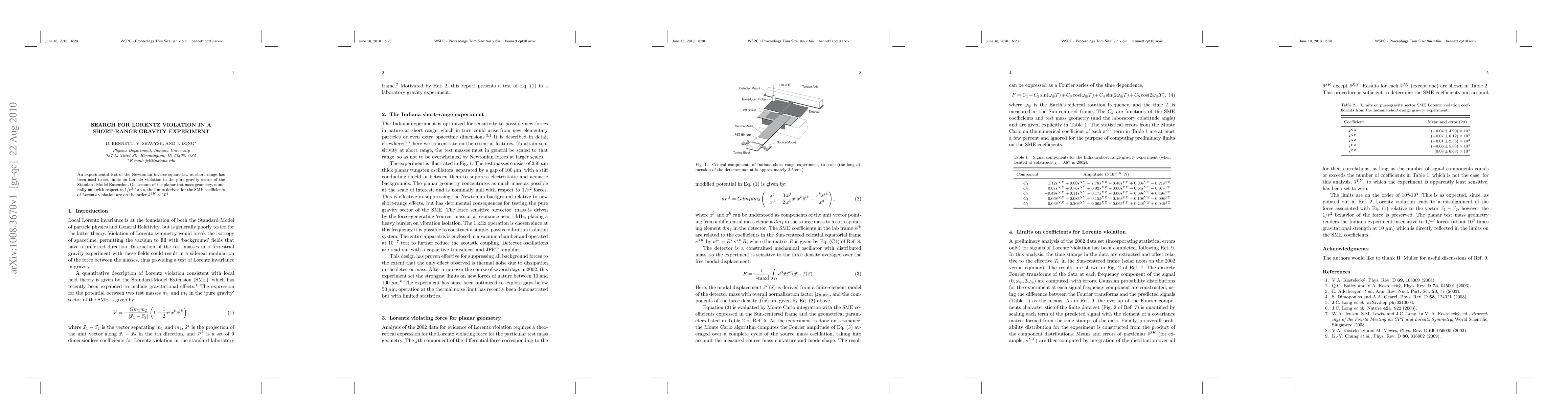 This paper reports an experiment testing the Newtonian inverse square law at short ranges to set limits on Lorentz violation in gravity, achieving constraints on SME coefficients of Lorentz violation at a level of s ~ 10000. The unique planar test mass geometry played a crucial role in these findings.