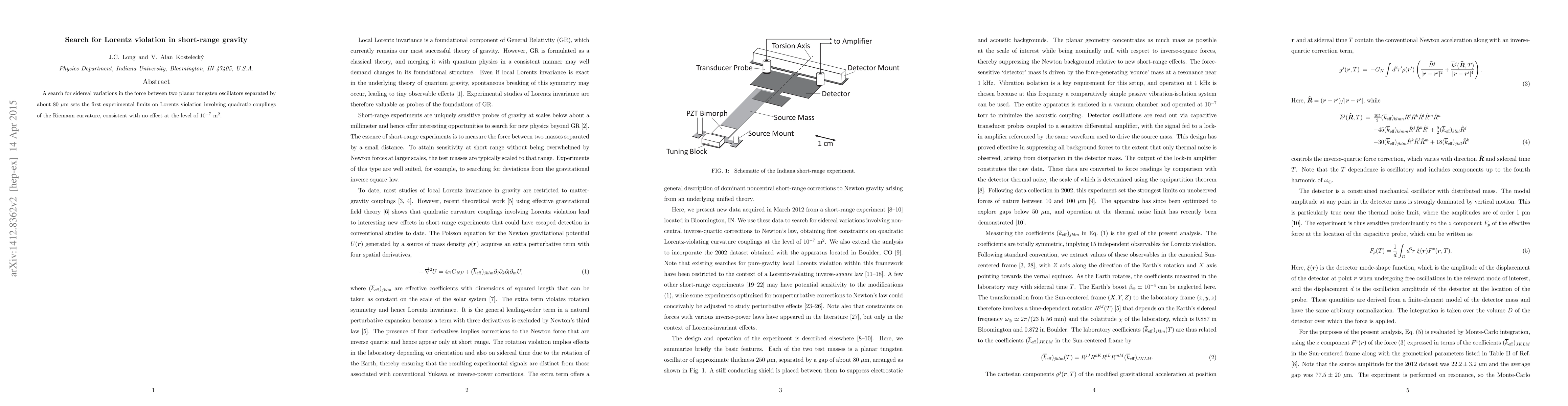 Researchers set limits on Lorentz violation in short-range gravity using a setup involving two planar tungsten oscillators, finding no significant effects at $10^{-7}$ m$^2$.