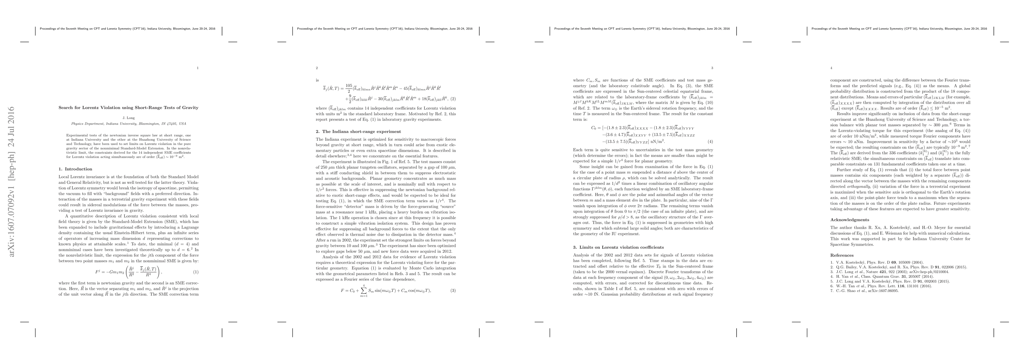 This paper reports experimental tests conducted at Indiana University and Huazhong University to set limits on Lorentz violation in gravity, achieving constraints of order $10^{-9}$ m$^{2}$ for 14 independent SME coefficients in the nonminimal Standard-Model Extension.