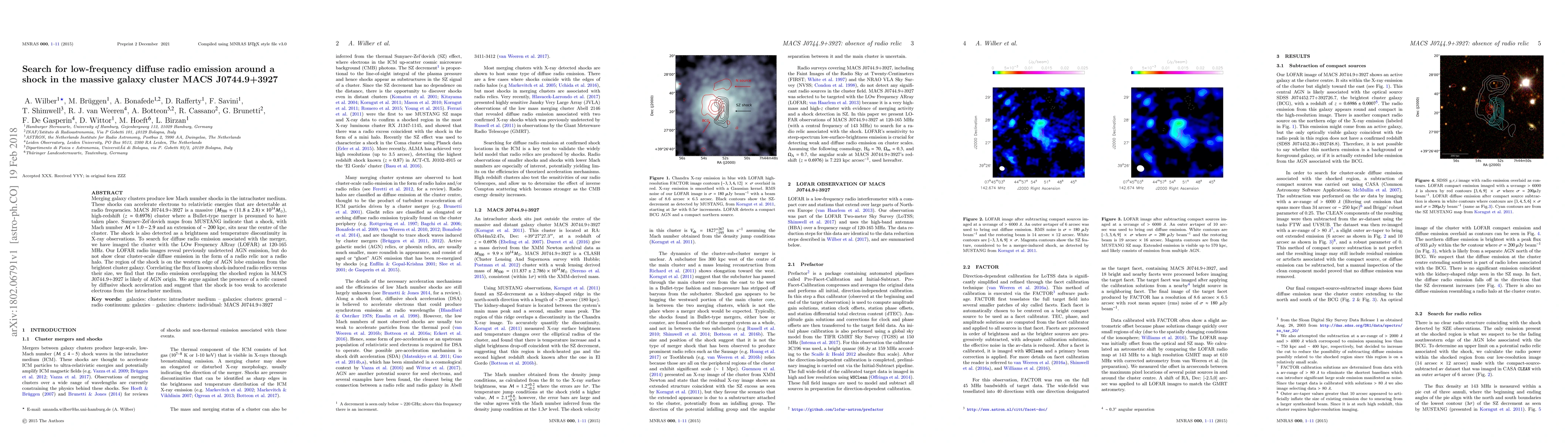The research investigates MACS J0744.9+3927, a massive, high-redshift merging galaxy cluster for low-frequency diffuse radio emission near a shock. Using LOFAR, they found no cluster-scale radio relic or halo, attributing previously undetected emission instead to the central active galactic nucleus (AGN), rather than shock-induced diffuse emission. The study suggests the shock is too weak to accelerate electrons from the intracluster medium.
