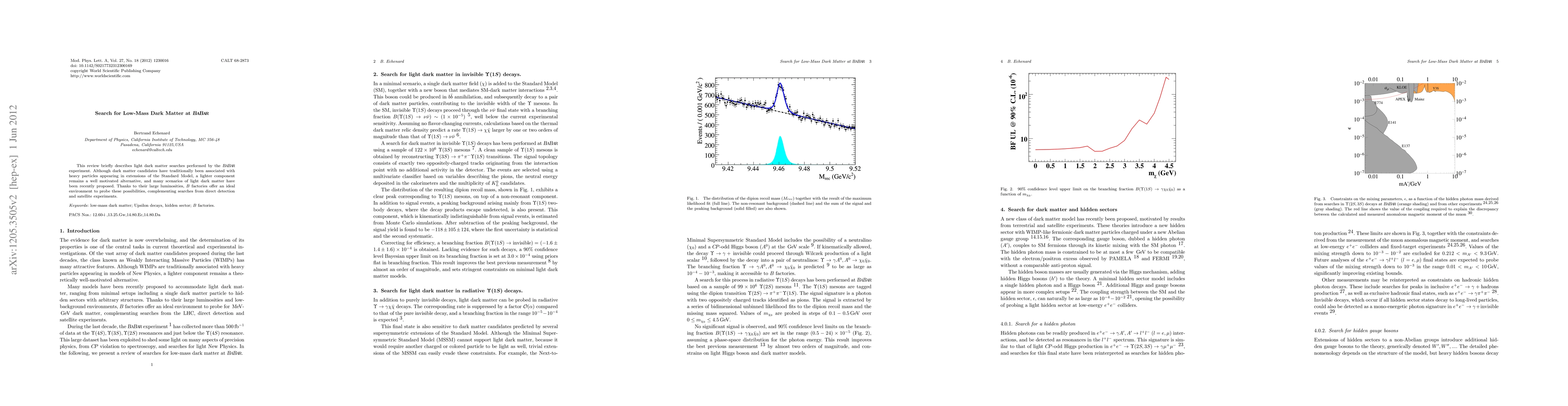 This review briefly describes light dark matter searches performed by the BABAR experiment. Although dark matter candidates have traditionally been associated with heavy particles appearing in extensions of the Standard Model, a lighter component remains a well motivated alternative, and many scenarios of light dark matter have been recently proposed. Thanks to their large luminosities, B factories offer an ideal environment to probe these possibilities, complementing searches from direct detection and satellite experiments.