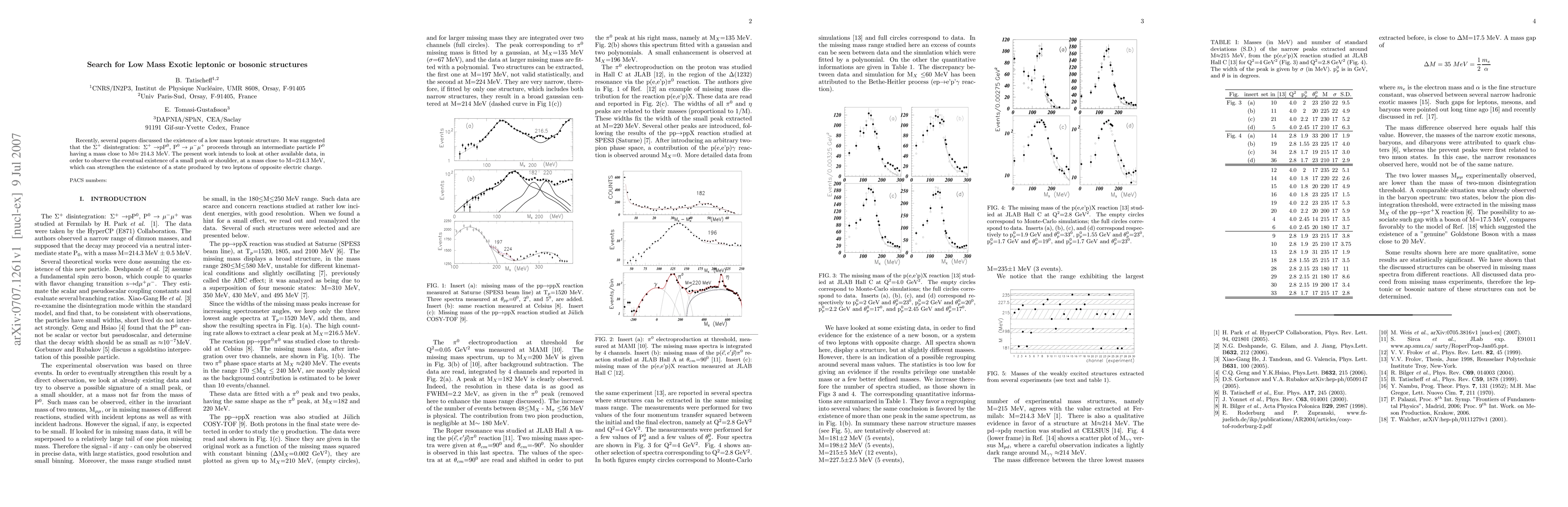 Recently, several papers discussed the existence of a low mass leptonic structure. It was suggested that the $\Sigma^{+}$ disintegration: $\Sigma^{+}\to$pP$^{0}$, P$^{0}\to\mu^{-}\mu^{+}$ proceeds through an intermediate particle P$^{0}$ having a mass close to M$\approx$~214.3 MeV. The present work intends to look at other available data, in order to observe the eventual existence of a small peak or shoulder, at a mass close to M=214.3 MeV, which can strengthen the existence of a state produced by two leptons of opposite electric charge.