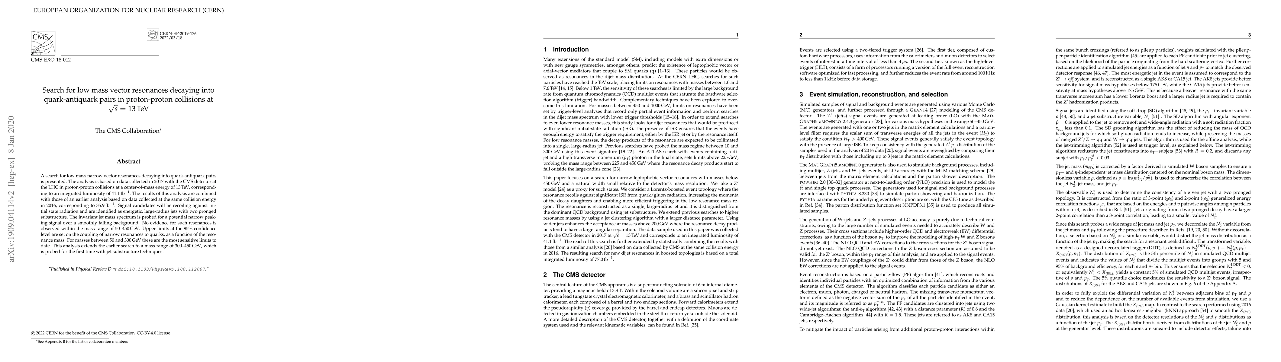 A search for low mass narrow vector resonances decaying into quark-antiquark pairs is presented. The analysis is based on data collected in 2017 with the CMS detector at the LHC in proton-proton collisions at a center-of-mass energy of 13 TeV, corresponding to an integrated luminosity of 41.1 fb$^{-1}$. The results of this analysis are combined with those of an earlier analysis based on data collected at the same collision energy in 2016, corresponding to 35.9 fb$^{-1}$. Signal candidates will be recoiling against initial state radiation and are identified as energetic, large-radius jets with two pronged substructure. The invariant jet mass spectrum is probed for a potential narrow peaking signal over a smoothly falling background. No evidence for such resonances is observed within the mass range of 50-450 GeV. Upper limits at the 95% confidence level are set on the coupling of narrow resonances to quarks, as a function of the resonance mass. For masses between 50 and 300 GeV these are the most sensitive limits to date. This analysis extends the earlier search to a mass range of 300-450 GeV, which is probed for the first time with jet substructure techniques.