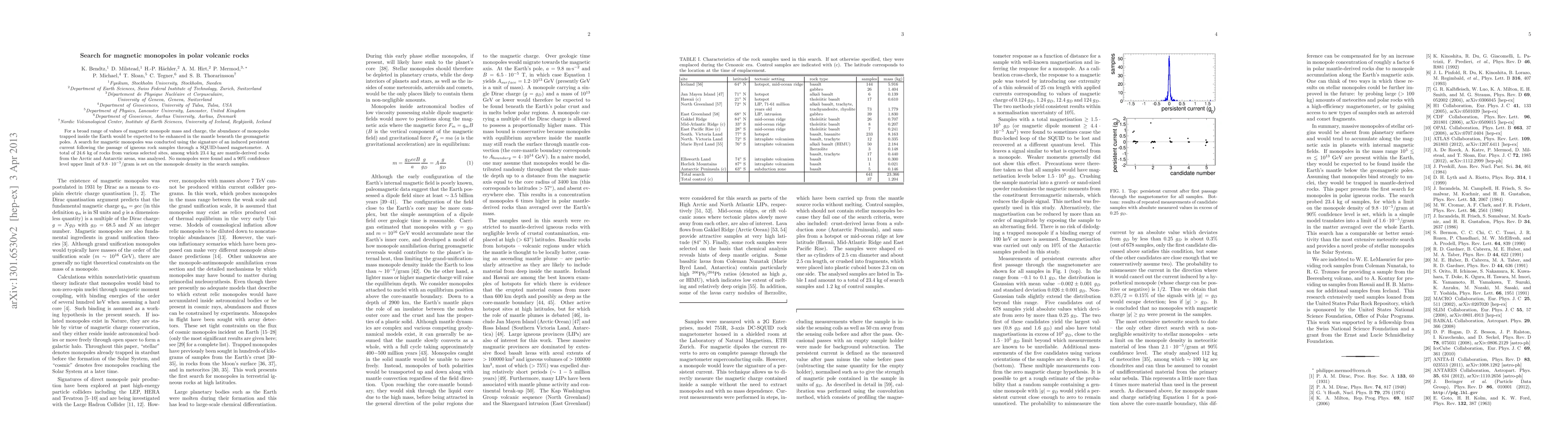 A search for magnetic monopoles in polar volcanic rocks using SQUID-based magnetometry found no monopoles, setting a 90% confidence level upper limit of $9.8\cdot 10^{-5}$/gram for monopole density in the analysed samples. This study focused on rocks from the Arctic and Antarctic, where monopole abundance is theoretically enhanced.