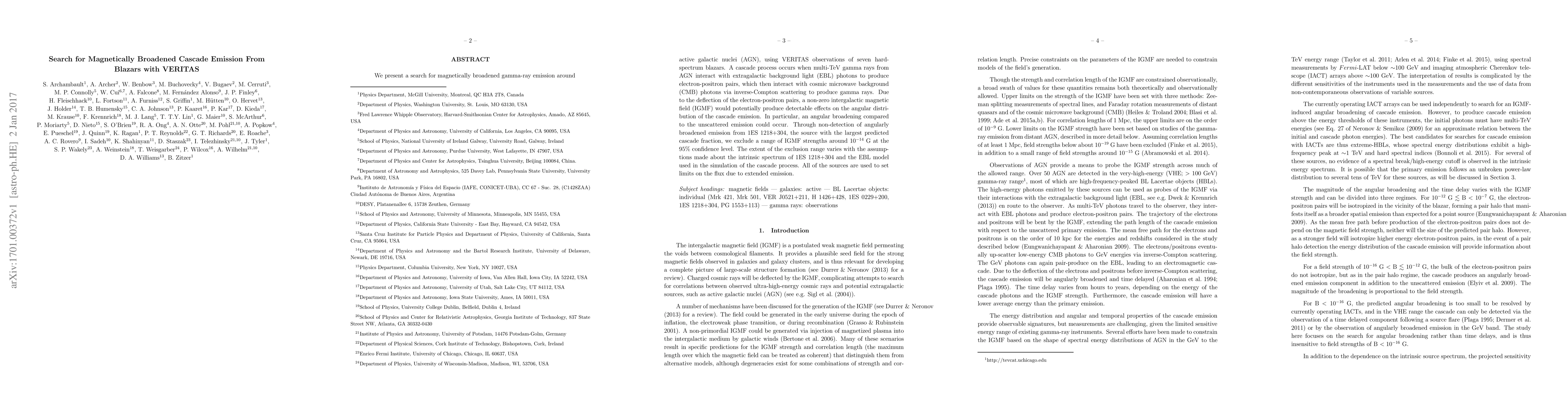 We present a search for magnetically broadened gamma-ray emission around active galactic nuclei (AGN), using VERITAS observations of seven hard-spectrum blazars. A cascade process occurs when multi-TeV gamma rays from AGN interact with extragalactic background light (EBL) photons to produce electron-positron pairs, which then interact with cosmic microwave background (CMB) photons via inverse-Compton scattering to produce gamma rays. Due to the deflection of the electron-positron pairs, a non-zero intergalactic magnetic field (IGMF) would potentially produce detectable effects on the angular distribution of the cascade emission. In particular, an angular broadening compared to the unscattered emission could occur. Through non-detection of angularly broadened emission from 1ES 1218+304, the source with the largest predicted cascade fraction, we exclude a range of IGMF strengths around $10^{-14}$G at the 95% confidence level. The extent of the exclusion range varies with the assumptions made about the intrinsic spectrum of 1ES 1218+304 and the EBL model used in the simulation of the cascade process. All of the sources are used to set limits on the flux due to extended emission.