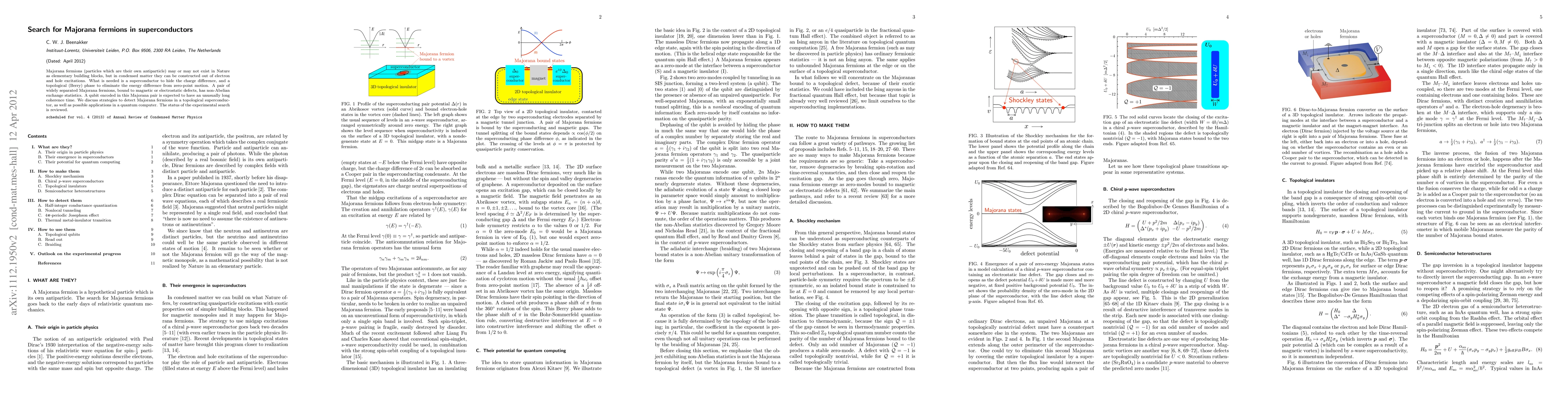 This paper reviews the theoretical and experimental search for Majorana fermions in superconductors, highlighting their potential role in quantum computing. It explores their origin, methods for creation, detection strategies, and applications, summarizing the current status of experimental progress.
