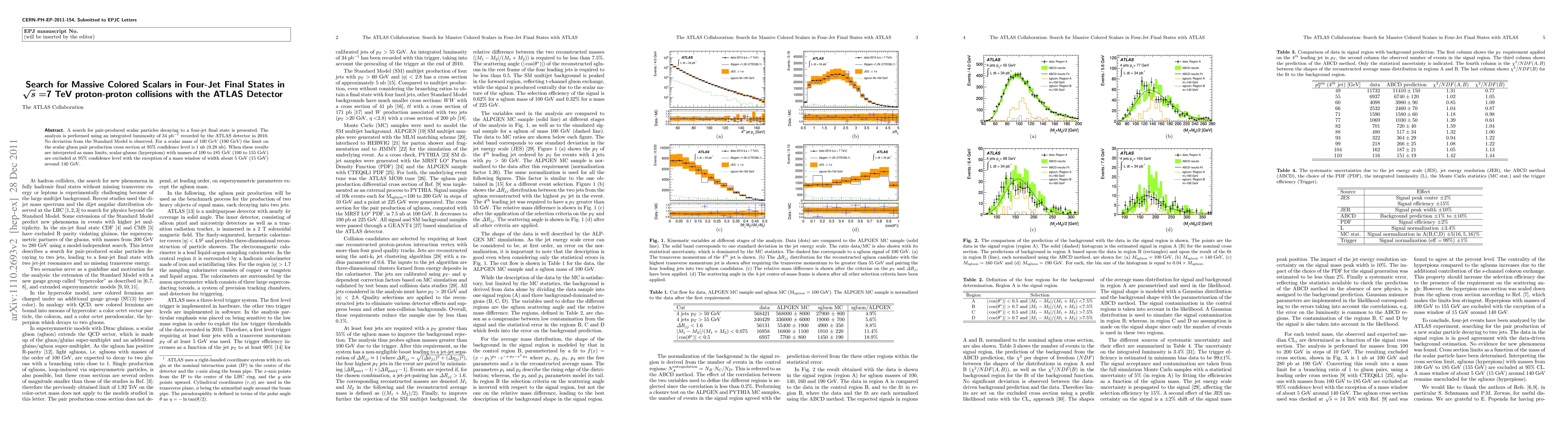 A search for pair-produced scalar particles decaying to a four-jet final state is presented. The analysis is performed using an integrated luminosity of 34 pb^-1 recorded by the ATLAS detector in 2010. No deviation from the Standard Model is observed. For a scalar mass of 100 GeV (190 GeV) the limit on the scalar gluon pair production cross section at 95% confidence level is 1 nb (0.28 nb). When these results are interpreted as mass limits, scalar-gluons (hyperpions) with masses of 100 to 185 GeV (100 to 155 GeV) are excluded at 95% confidence level with the exception of a mass window of width about 5 GeV (15 GeV) around 140 GeV.