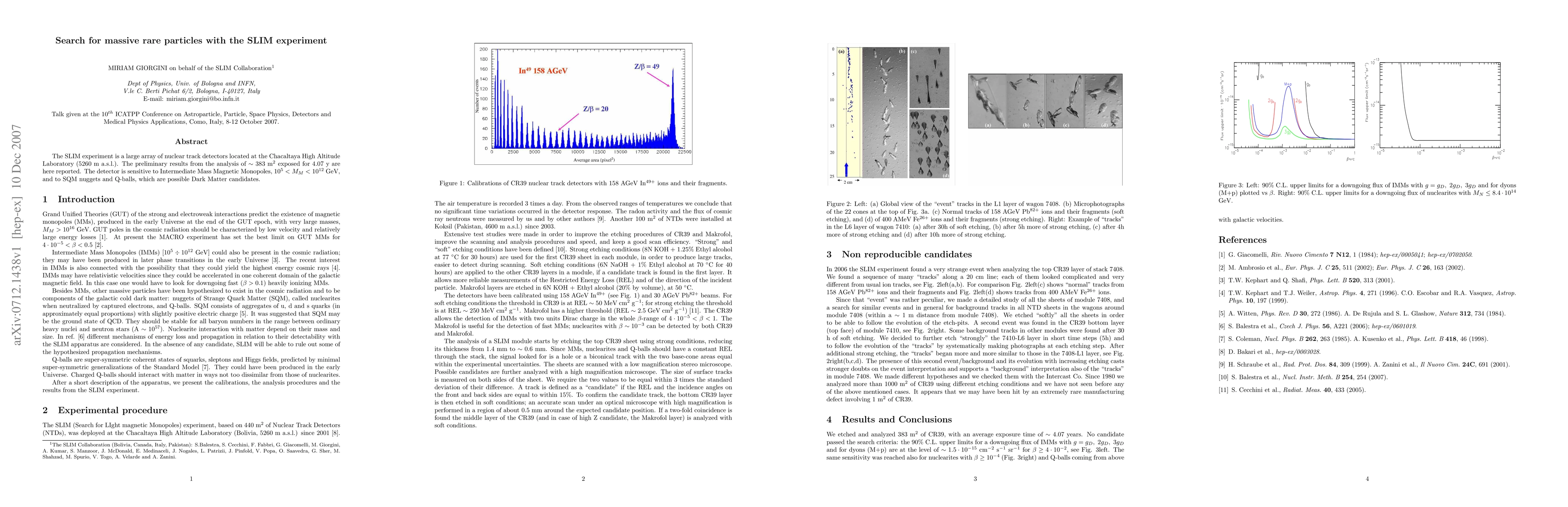 The SLIM experiment is a large array of nuclear track detectors located at the Chacaltaya High Altitude Laboratory (5260 m a.s.l.). The preliminary results from the analysis of ~383 m^2 exposed for 4.07 y are here reported. The detector is sensitive to Intermediate Mass Magnetic Monopoles, 10^5 < M_M < 10^12 GeV, and to SQM nuggets and Q-balls, which are possible Dark Matter candidates.