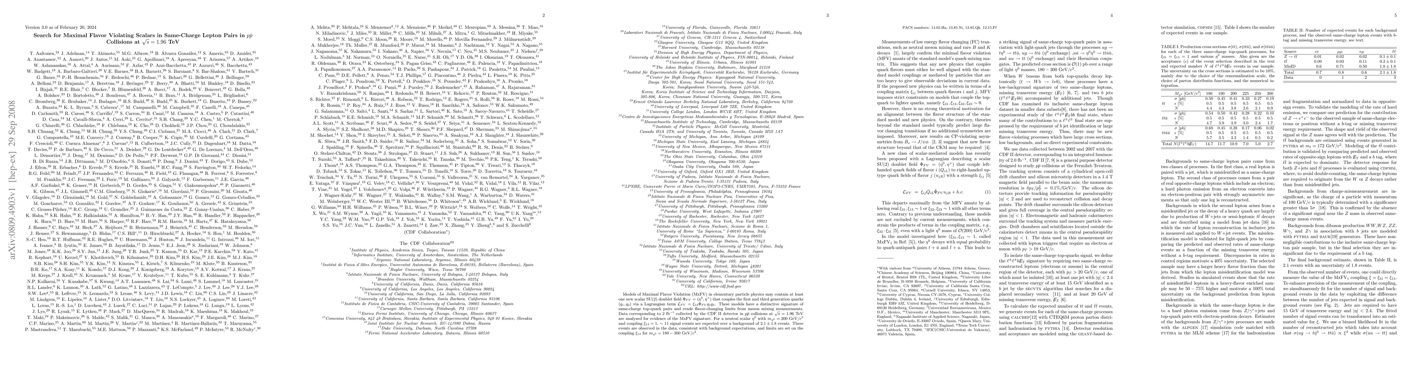 The paper reports a search for Maximal Flavor Violating (MxFV) scalars in same-charge lepton pairs from $par{p}$ collisions at $sqrt{s} = 1.96$ TeV, using data from CDF II detector. Analyzing for a neutral scalar $eta^0$ with specific mass and coupling, they expected around 11 signal events but observed only 3, in line with background expectations. The study sets limits on the coupling $xi_{13}$ for $m_{eta^0}$ ranging from 180 to 300 GeV/$c^2$.