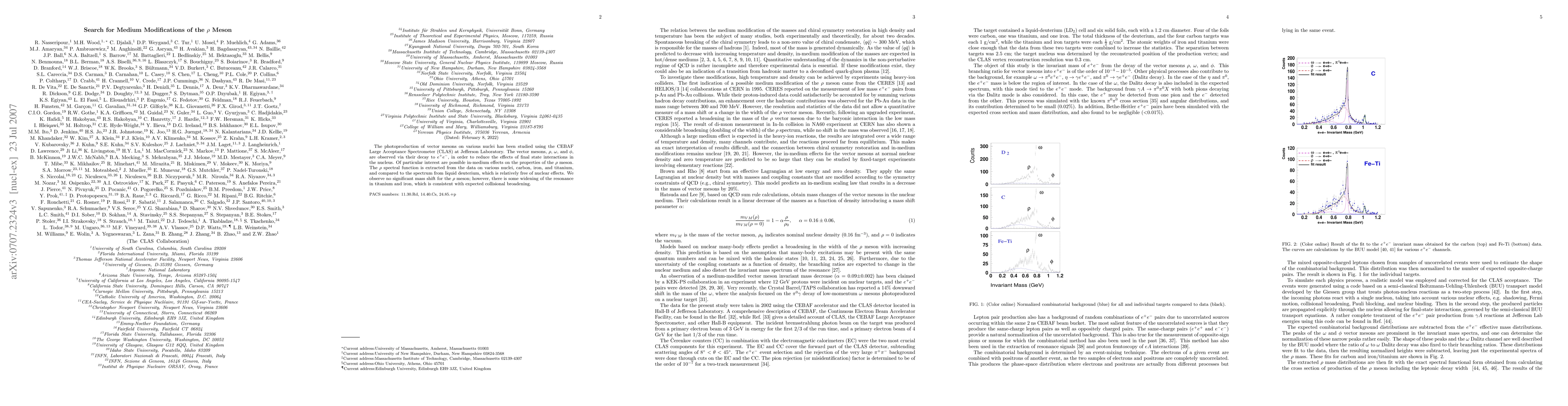 The photoproduction of vector mesons on various nuclei has been studied using the CEBAF Large Acceptance Spectrometer (CLAS) at Jefferson Laboratory. The vector mesons, $\rho$, $\omega$, and $\phi$, are observed via their decay to $e^+e^-$, in order to reduce the effects of final state interactions in the nucleus. Of particular interest are possible in-medium effects on the properties of the $\rho$ meson. The $\rho$ spectral function is extracted from the data on various nuclei, carbon, iron, and titanium, and compared to the spectrum from liquid deuterium, which is relatively free of nuclear effects. We observe no significant mass shift for the $\rho$ meson; however, there is some widening of the resonance in titanium and iron, which is consistent with expected collisional broadening.
