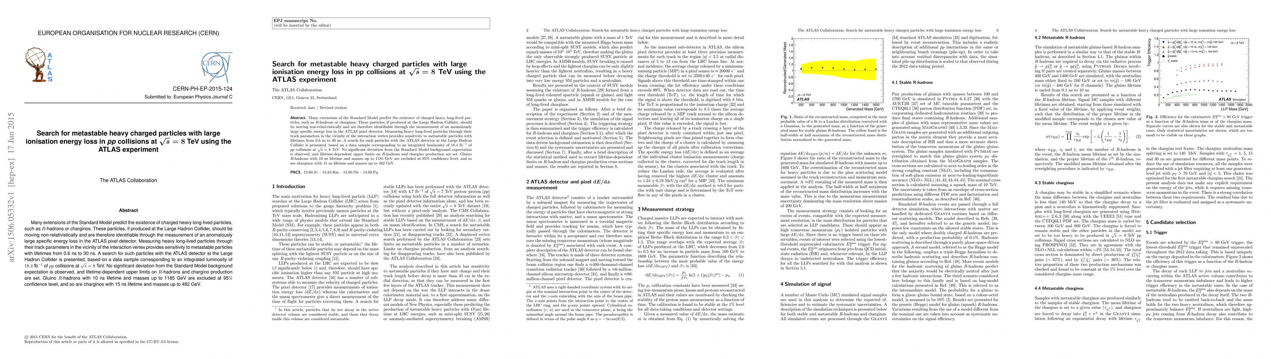 This paper reports a search for metastable heavy charged particles in $pp$ collisions at $\sqrt{s}$ = 8 TeV using the ATLAS detector, focusing on large ionisation energy loss. No evidence of such particles was found, leading to exclusion of gluino $R$-hadrons and charginos within specified lifetimes and mass ranges.