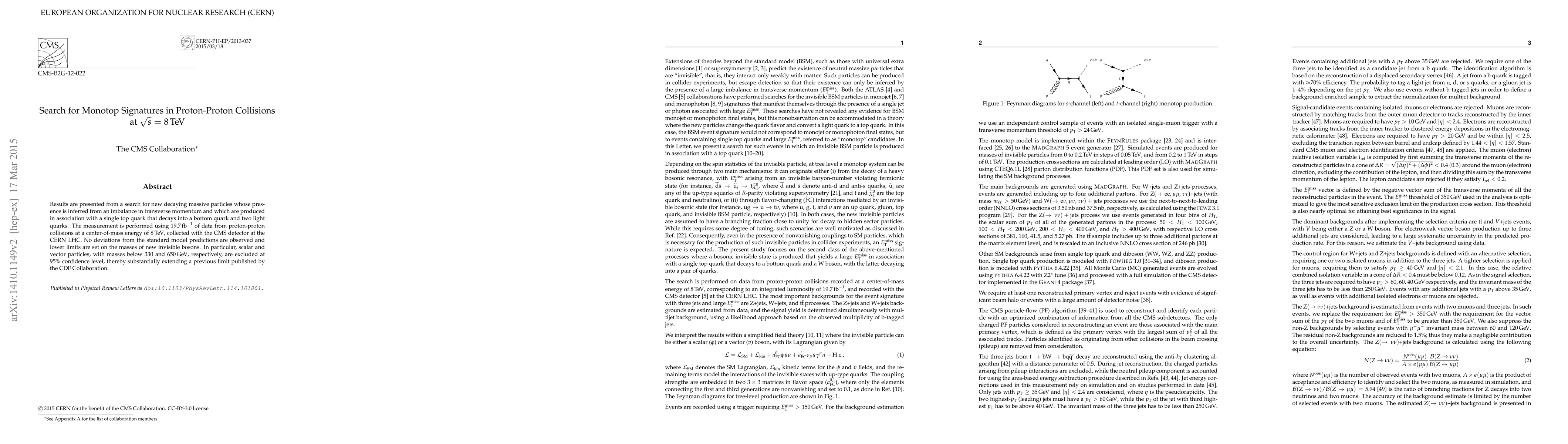 Results are presented from a search for new decaying massive particles whose presence is inferred from an imbalance in transverse momentum and which are produced in association with a single top quark that decays into a bottom quark and two light quarks. The measurement is performed using 19.7 inverse femtobarns of data from proton-proton collisions at a center-of-mass energy of 8 TeV, collected with the CMS detector at the CERN LHC. No deviations from the standard model predictions are observed and lower limits are set on the masses of new invisible bosons. In particular, scalar and vector particles, with masses below 330 and 650 GeV, respectively, are excluded at 95% confidence level, thus substantially extending a previous limit published by the CDF Collaboration.