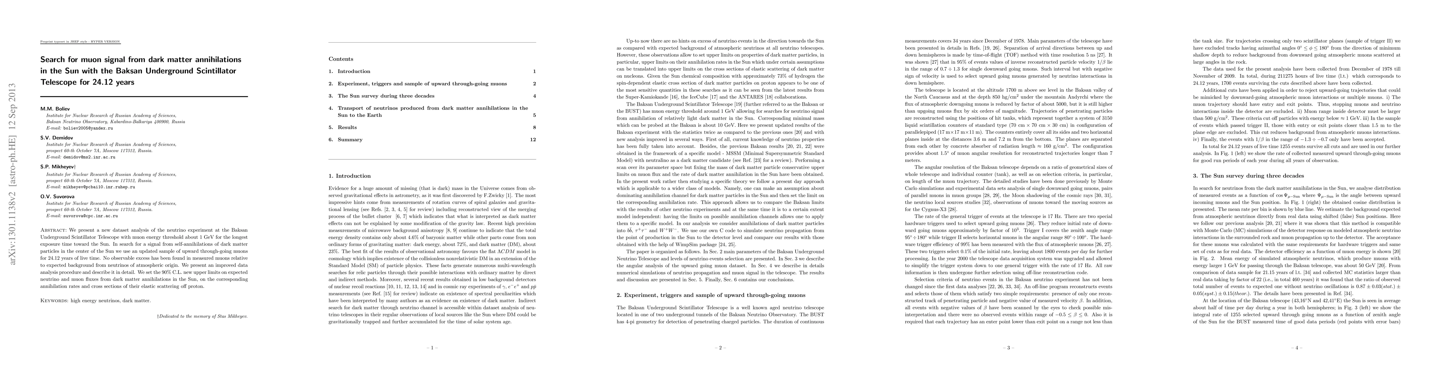 This study, using 24.12 years of data from the Baksan Underground Scintillator Telescope, analyzed muon signals potentially from dark matter annihilations in the Sun. No significant excess over background from atmospheric neutrinos was detected, leading to improved upper limits on dark matter annihilation rates and cross sections with elastic scattering off protons.