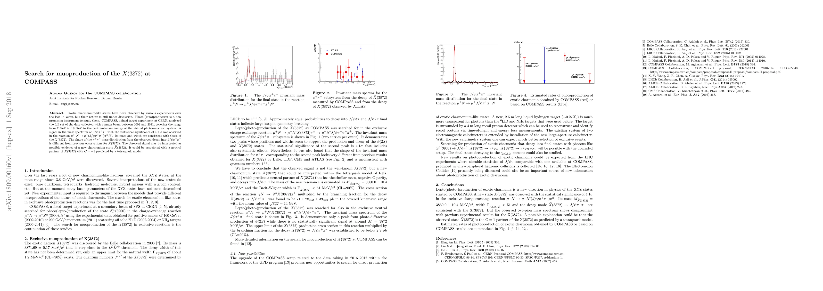 Exotic charmonium-like states have been observed by various experiments over the last 15 years, but their nature is still under discussion. Photo-(muo)production is a new promising instrument to study them. COMPASS, a fixed target experiment at CERN, analyzed the full set of the data collected with a muon beam between 2002 and 2011, covering the range from 7 GeV to 19 GeV in the centre-of-mass energy of the virtual photon-nucleon system. A signal in the mass spectrum of $J/\psi\pi^+\pi^-$ with the statistical significance of 4.1 $\sigma$ was observed in the reaction $\mu^+~N \rightarrow \mu^+(J/\psi\pi^+\pi^- )\pi^{\pm} N'$. Its mass and width are consistent with those of the $X(3872)$. The shape of the $\pi^+\pi^-$ mass distribution from the observed decay into $J/\psi\pi^+\pi^-$ is different from previous observations for $X(3872)$. The observed signal may be interpreted as possible evidence of a new charmonium state $\widetilde{X}(3872)$. It could be associated with a neutral partner of $X(3872)$ with $C = -1$ predicted by a tetraquark model.