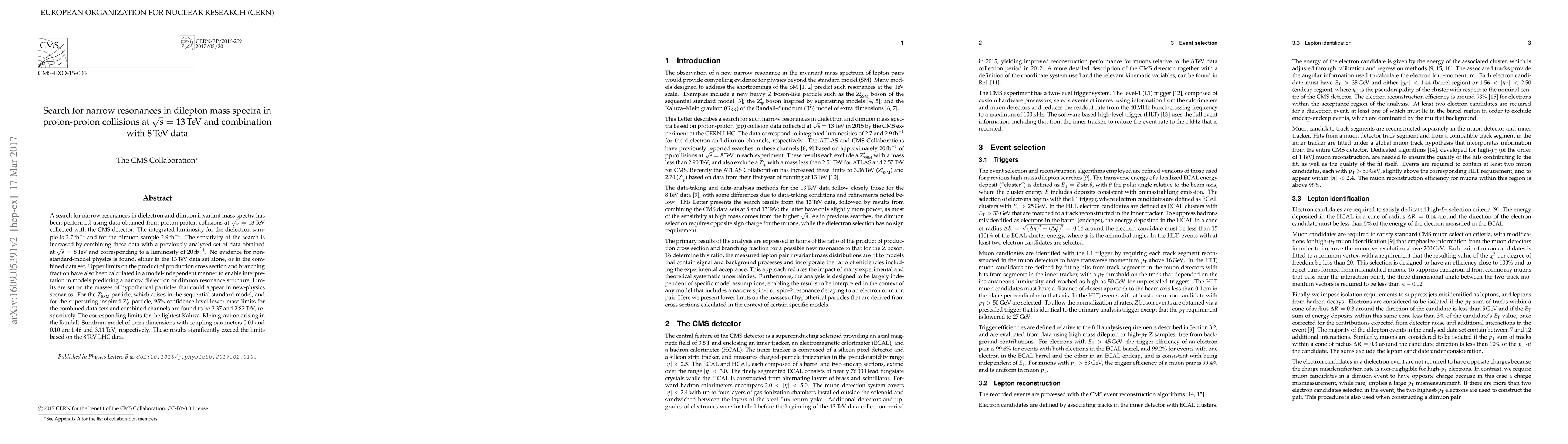 This paper reports a search for narrow resonances in dilepton mass spectra from proton-proton collisions at 13 TeV and combines these results with data from 8 TeV collisions. No evidence for new physics was found, and new upper limits on the masses of hypothetical particles were established, significantly exceeding previous limits.