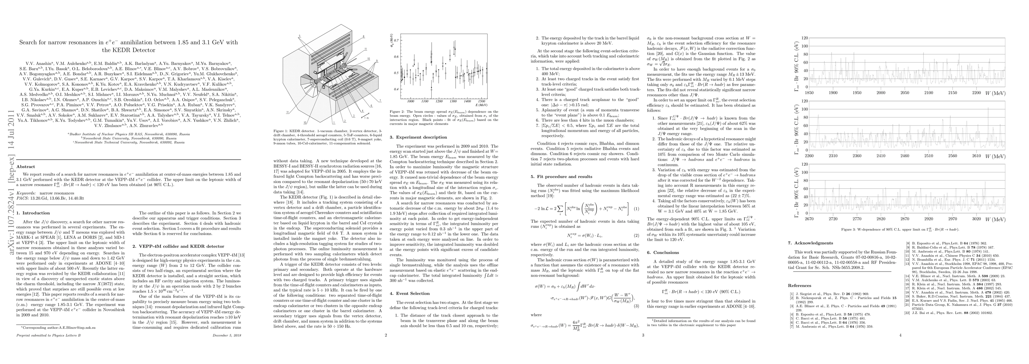 We report results of a search for narrow resonances in e+ e- annihilation at center-of-mass energies between 1.85 and 3.1 GeV performed with the KEDR detector at the VEPP-4M e+ e- collider. The upper limit on the leptonic width of a narrow resonance Gamma(R -> ee) Br(R -> hadr) < 120 eV has been obtained (at 90 % C.L.).