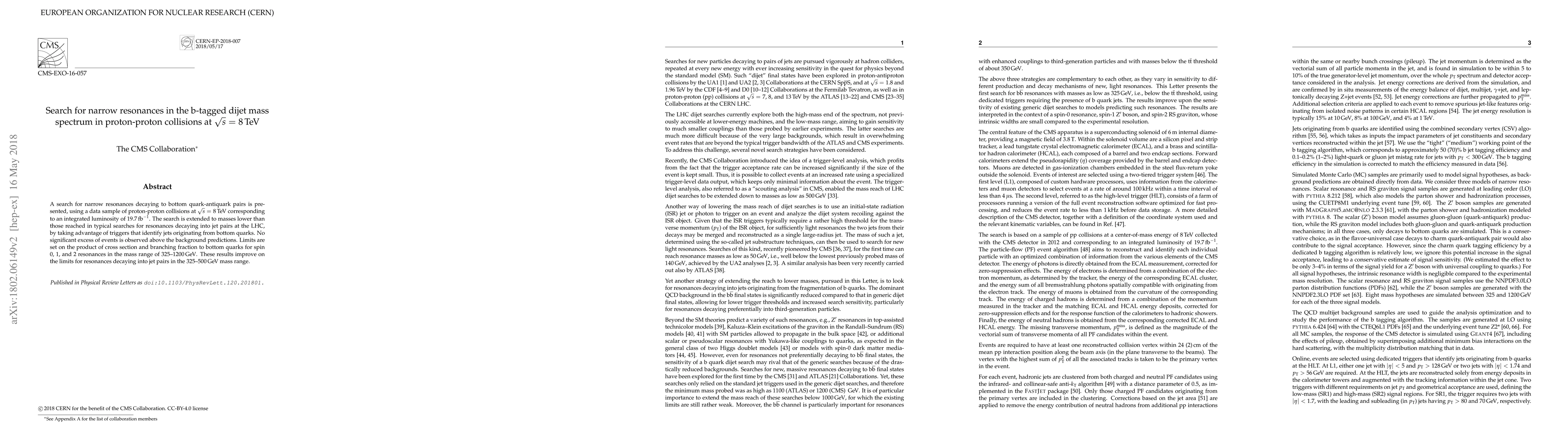 This study investigates narrow resonances decaying into bottom quark-antiquark pairs in proton-proton collisions at 8 TeV, using a data sample with 19.7 fb$^{-1}$ luminosity. No significant excess is observed, leading to improved limits on cross section and branching fractions for spin 0, 1, and 2 resonances in the 325-1200 GeV mass range.