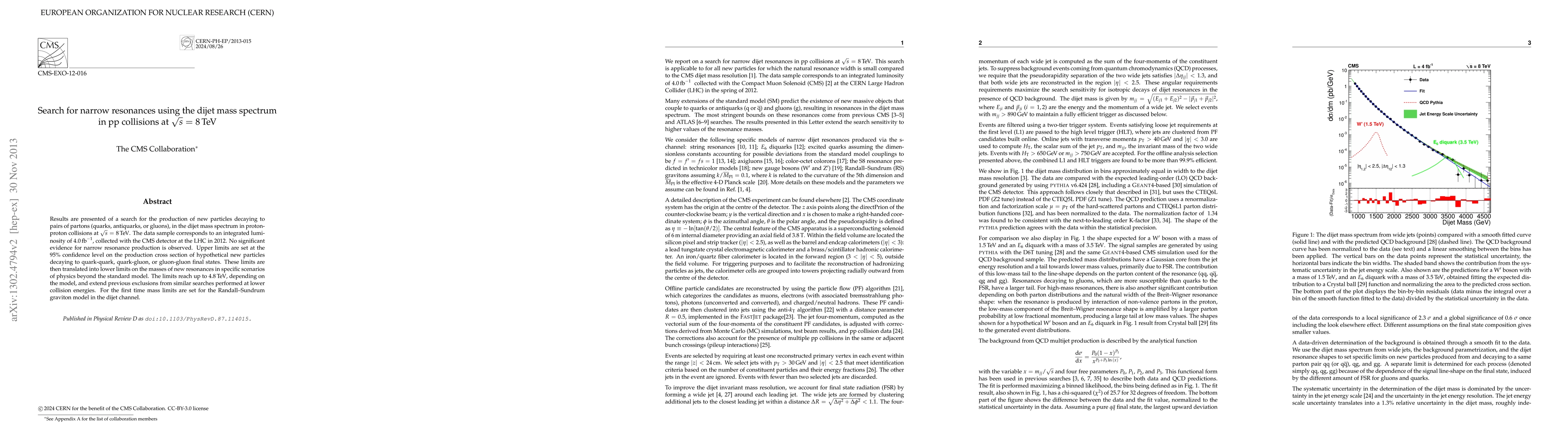 Results are presented of a search for the production of new particles decaying to pairs of partons (quarks, antiquarks, or gluons), in the dijet mass spectrum in proton-proton collisions at sqrt(s) = 8 TeV. The data sample corresponds to an integrated luminosity of 4.0 inverse femtobarns, collected with the CMS detector at the LHC in 2012. No significant evidence for narrow resonance production is observed. Upper limits are set at the 95% confidence level on the production cross section of hypothetical new particles decaying to quark-quark, quark-gluon, or gluon-gluon final states. These limits are then translated into lower limits on the masses of new resonances in specific scenarios of physics beyond the standard model. The limits reach up to 4.8 TeV, depending on the model, and extend previous exclusions from similar searches performed at lower collision energies. For the first time mass limits are set for the Randall-Sundrum graviton model in the dijet channel.