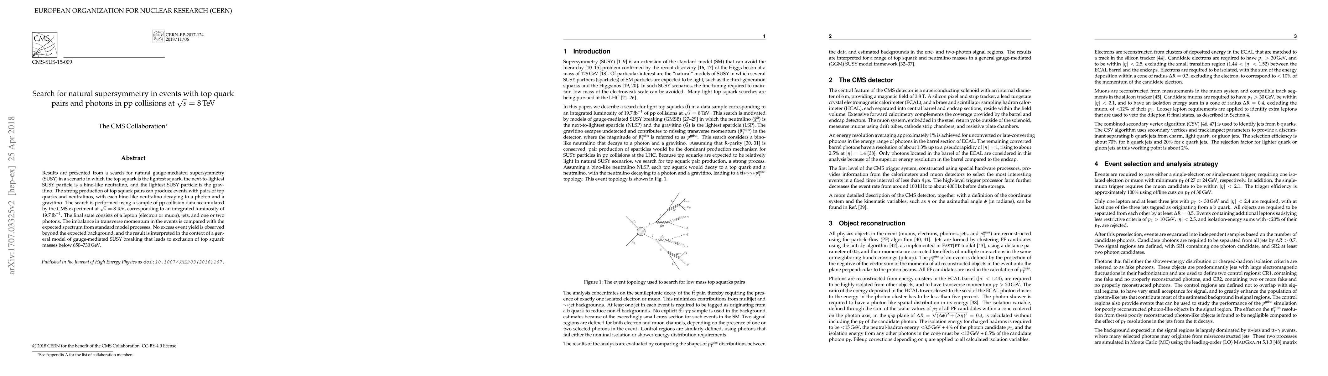This research by the CMS experiment at CMS, using 8 TeV pp collisions and 19.7 fb^-1 of data, sought evidence of natural supersymmetry (SUSY) with top squarks as the lightest squarks. The focus was on a scenario with bino-like neutralinos decaying to photons and gravitinos. No significant excess of events beyond standard model predictions was found, leading to exclusion of top squark masses below 650-730 GeV in a general gauge-mediated SUSY breaking model.