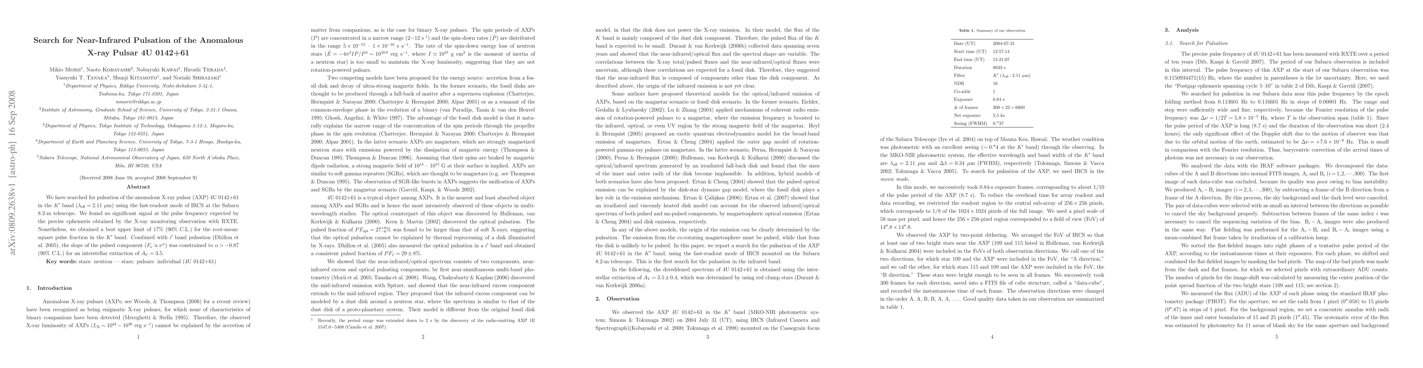 Researchers searched for pulsation in the Anomalous X-ray Pulsar 4U 0142+61 using infrared spectroscopy and found no significant signal, setting an upper limit on pulse fraction.