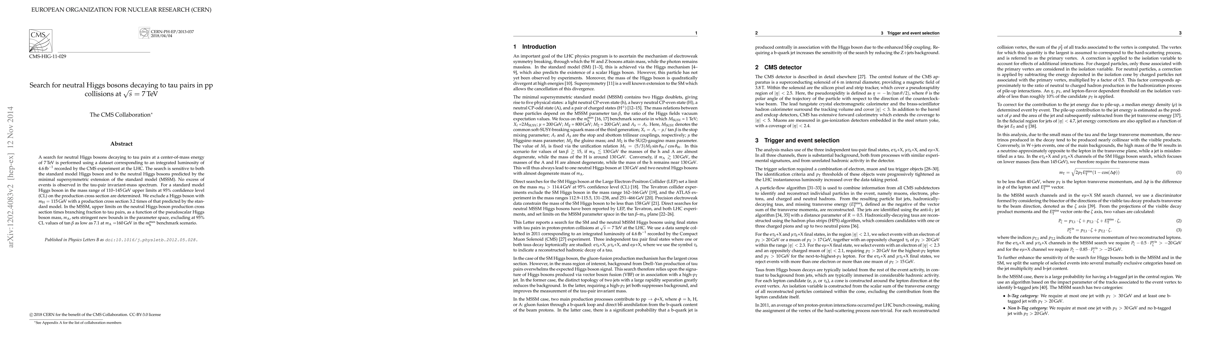 Researchers searched for neutral Higgs bosons decaying to tau pairs in proton-proton collisions at 7 TeV, finding no excess events or significant bounds on supersymmetric models.